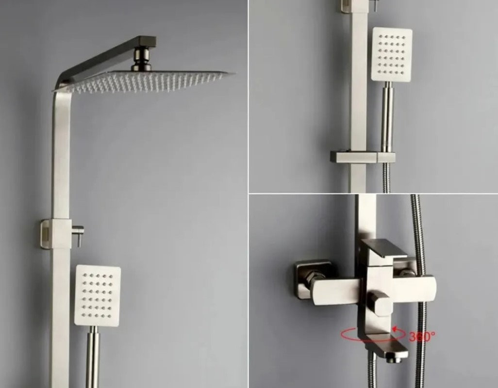 Комплектация: верхний душ, душевая штанга, держатель душевой лейки, ручной душ, смеситель, шланг, эксцентрики, декоративные чашки;