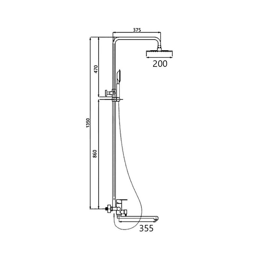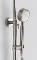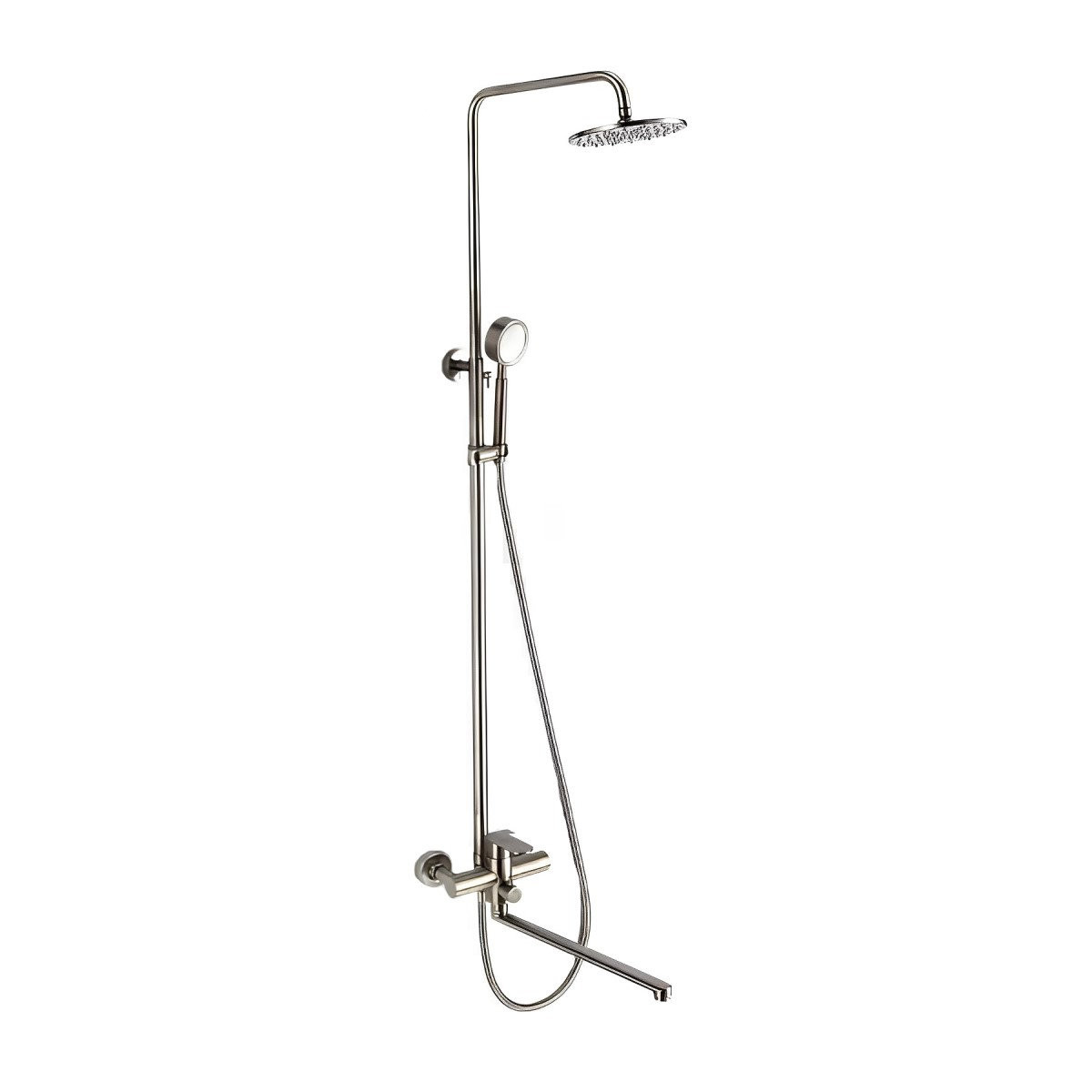 Душевая система D-Lin. Изготовлена из высококачественной нержавеющей стали. Тропический душ круглой формы имеет оптимальный размер 20х20 см., легко очищается благодаря силиконовым форсункам. Длинный поворотный излив для наполнения ванны. Душевая штанга регулируется по высоте на 47 см.