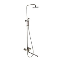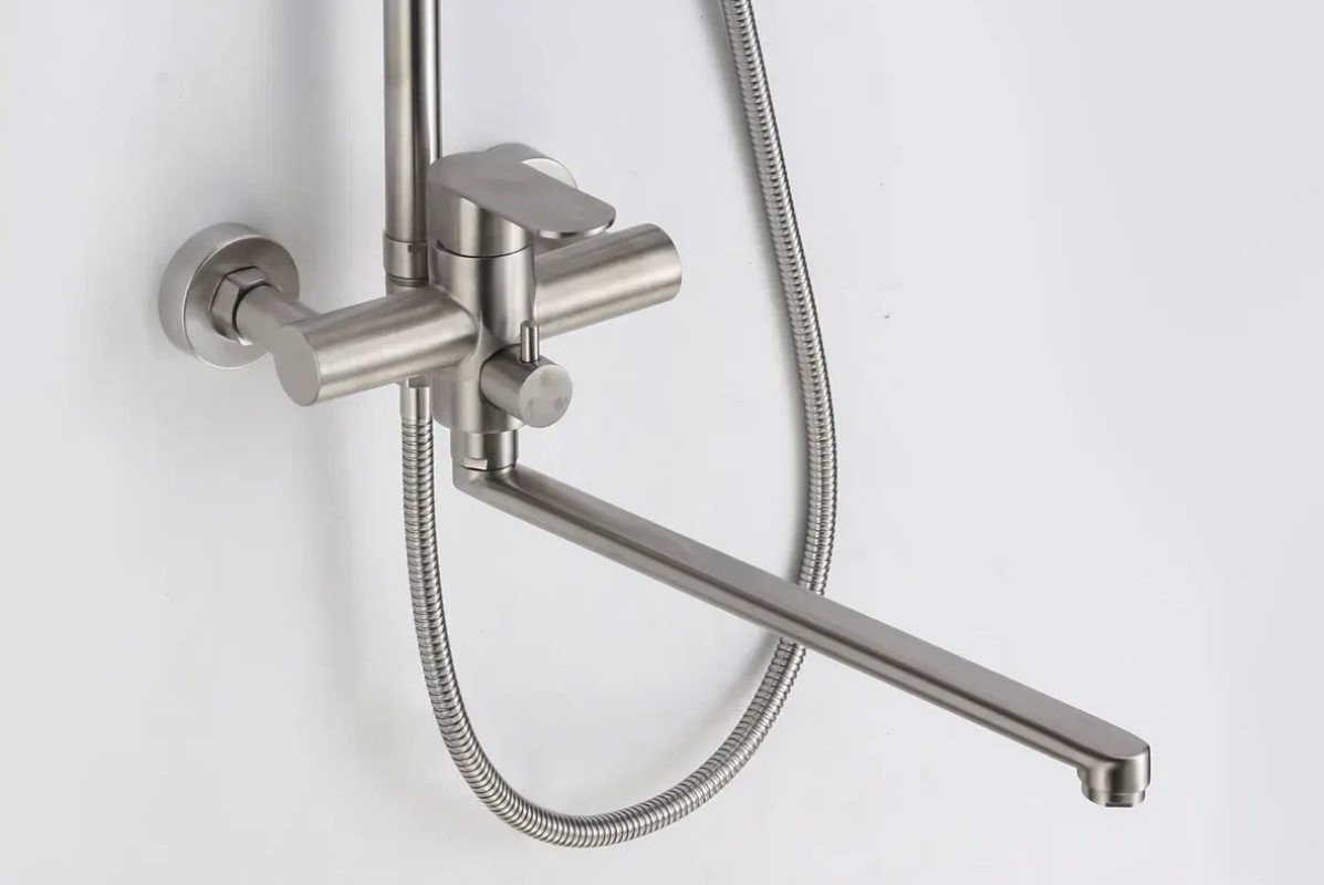Комплектация: верхний душ, душевая штанга, держатель душевой лейки, ручной душ, смеситель, шланг, эксцентрики, декоративные чашки;