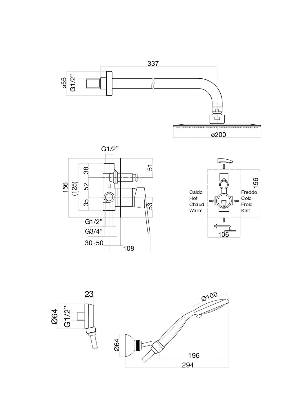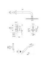 Комплектация: верхний душ, душевая штанга, держатель душевой лейки, ручной душ, смеситель, шланг;