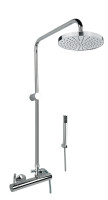 Комплектация: верхний душ, душевая штанга, держатель душевой лейки, ручной душ, смеситель, шланг;