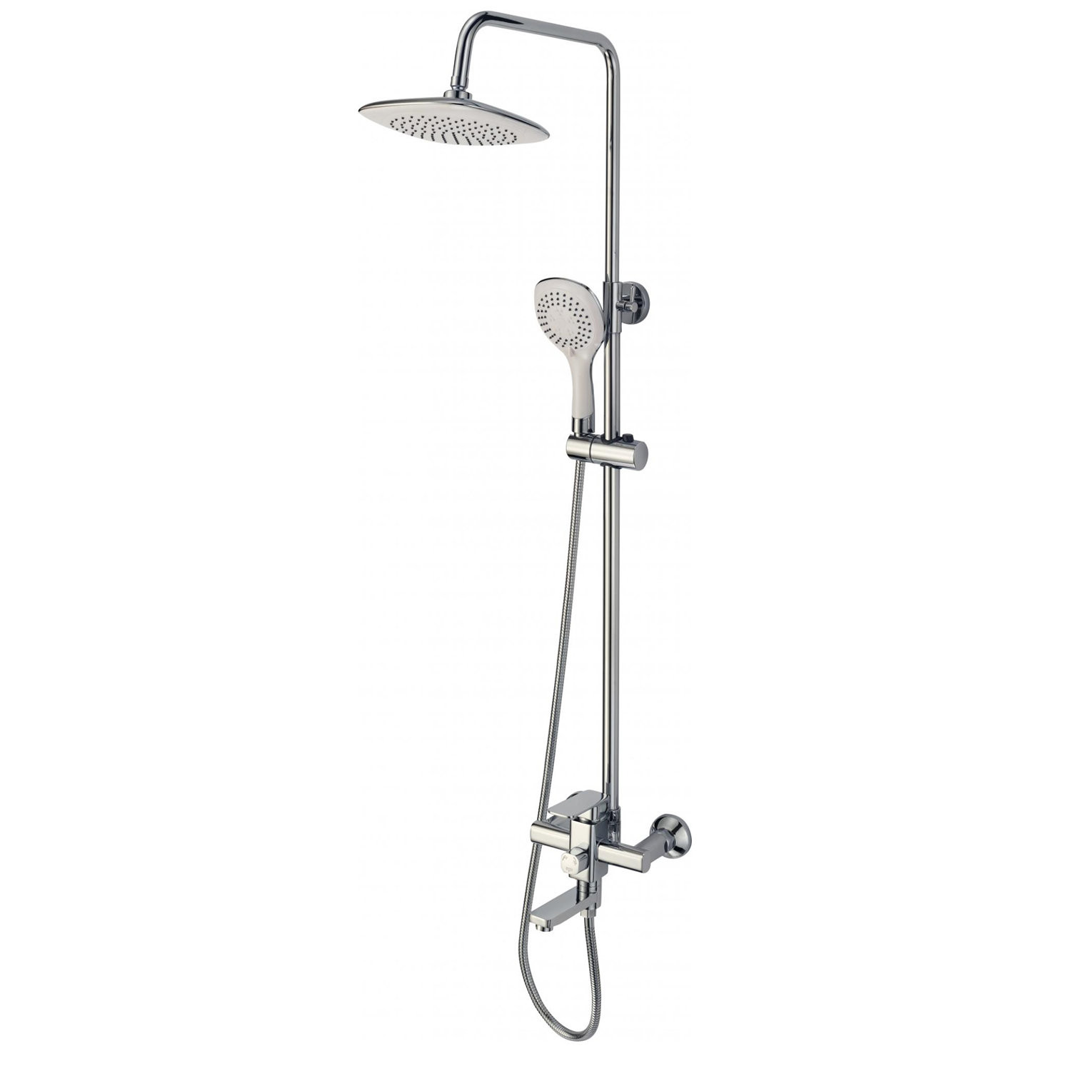 Комплектация: верхний душ, душевая штанга с держателем лейки, ручной душ, смеситель, шланг;
