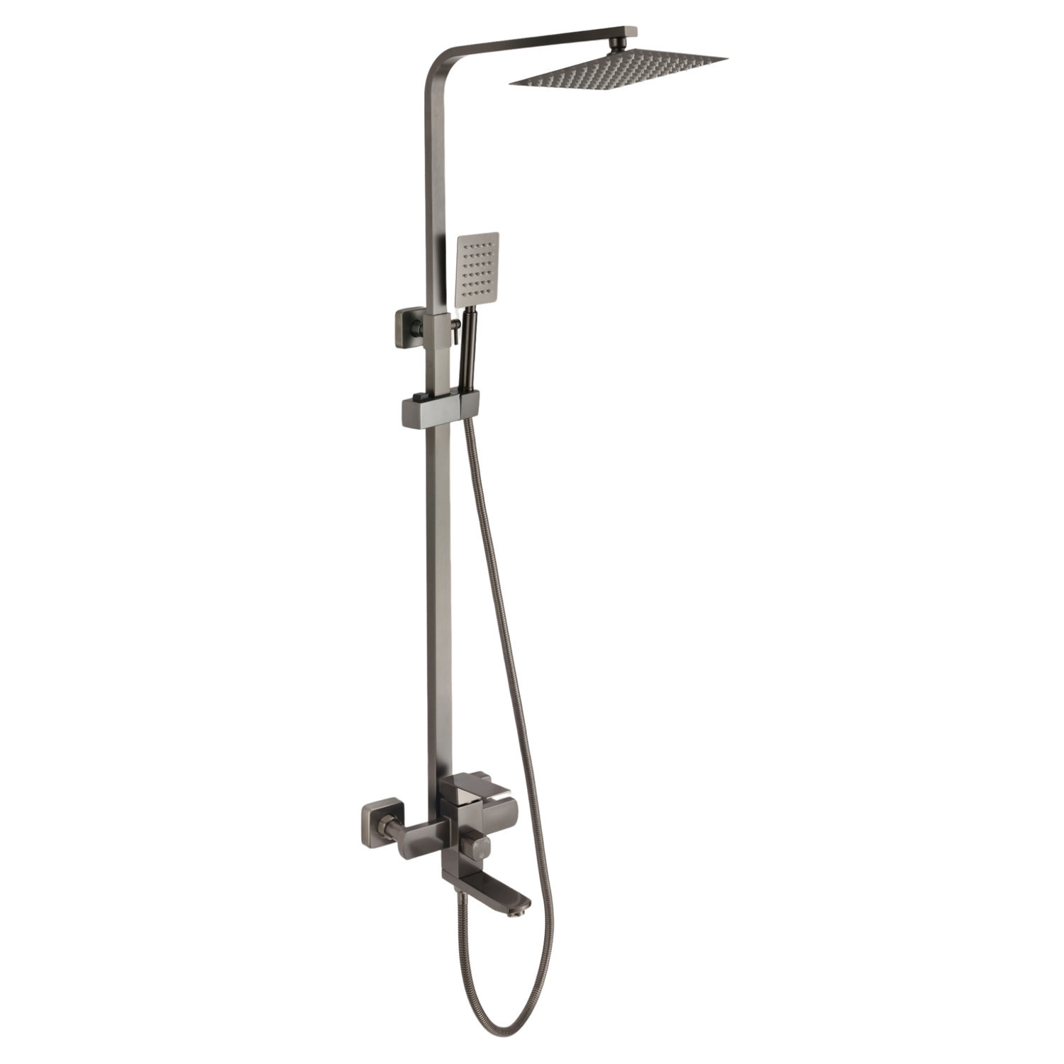 Комплектация: верхний душ, душевая штанга с держателем лейки, ручной душ, смеситель, шланг;