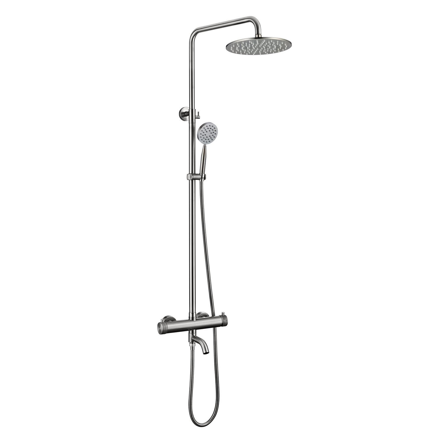 Комплектация: верхний душ, душевая штанга с держателем лейки, ручной душ, смеситель, шланг;