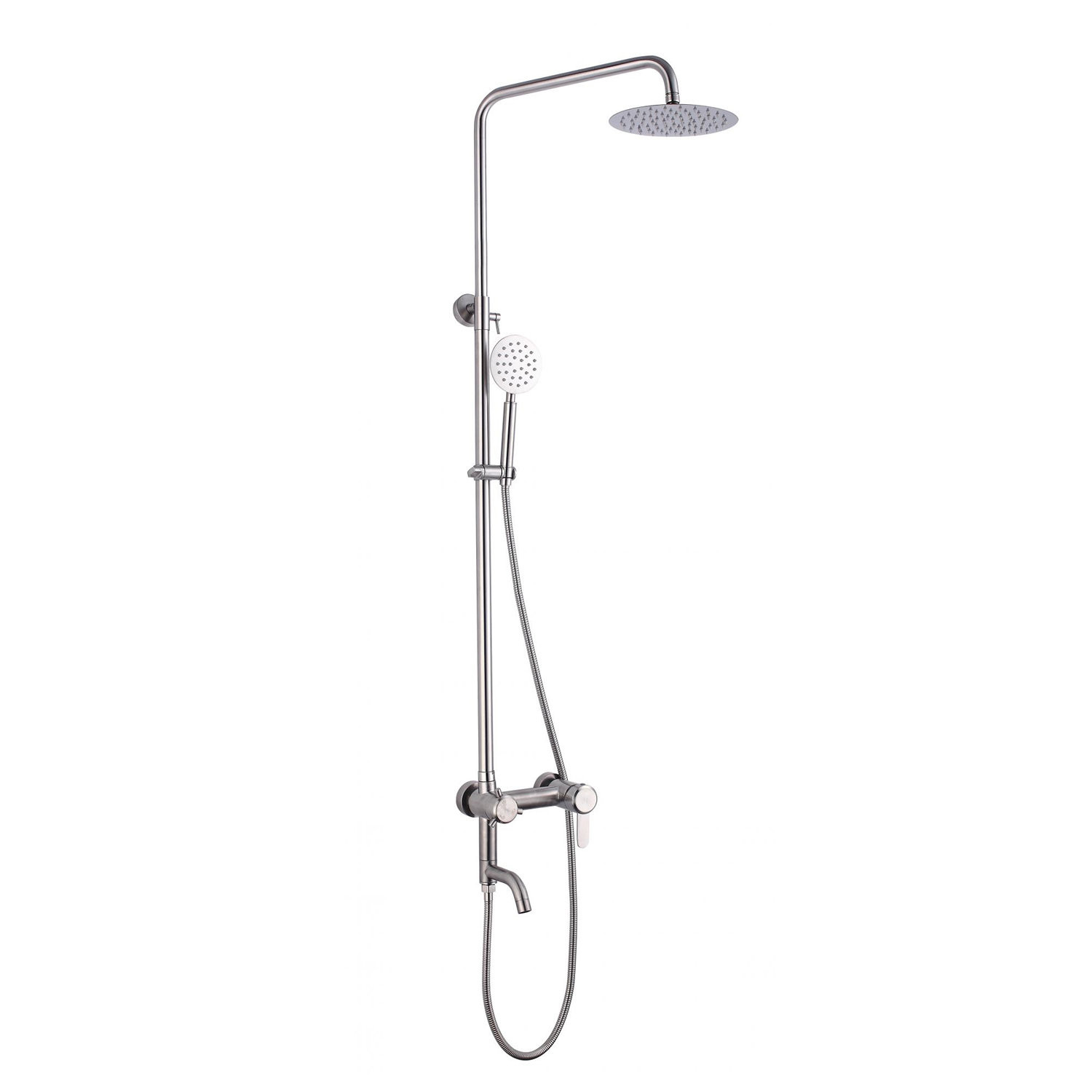 Комплектация: верхний душ, душевая штанга с держателем лейки, ручной душ, смеситель, шланг;