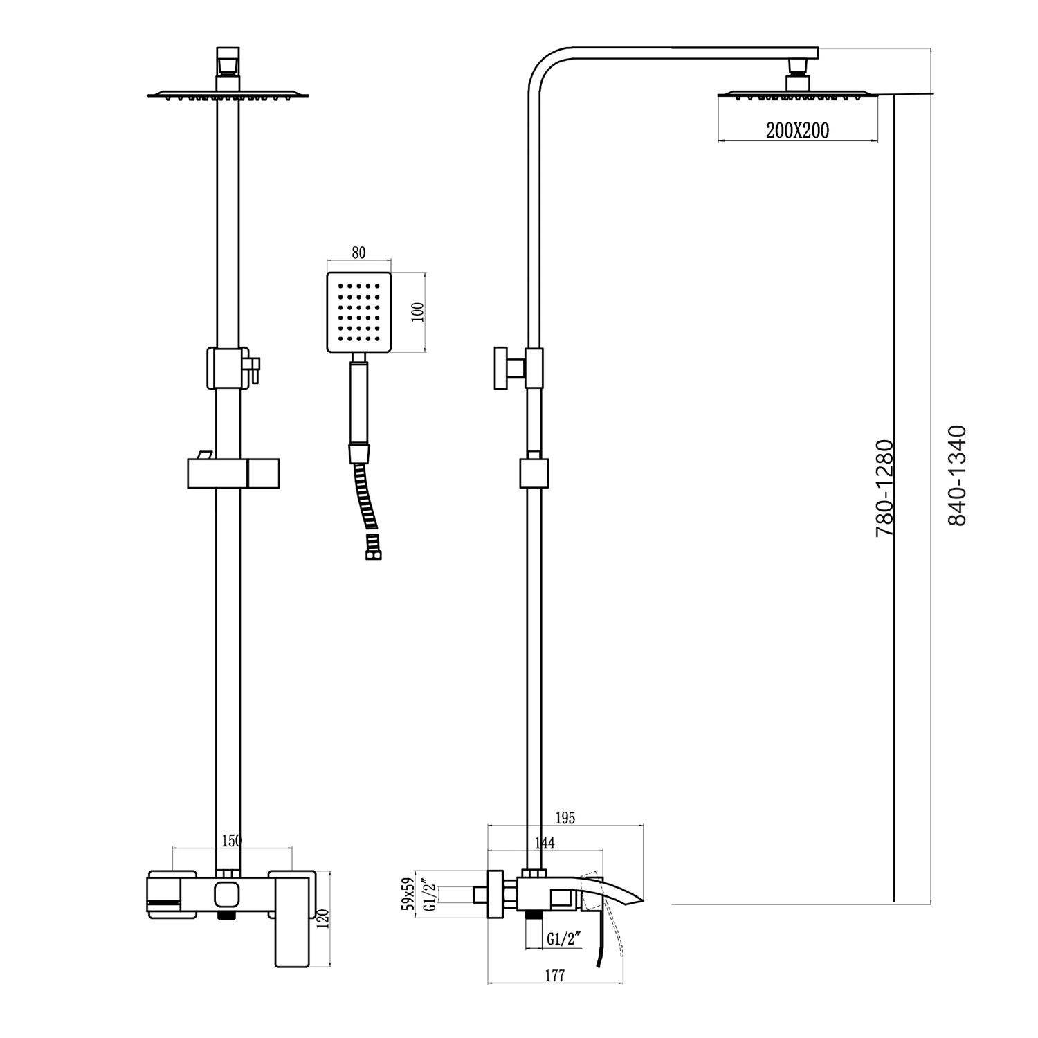 Комплектация: верхний душ, душевая штанга с держателем лейки, ручной душ, смеситель, шланг;