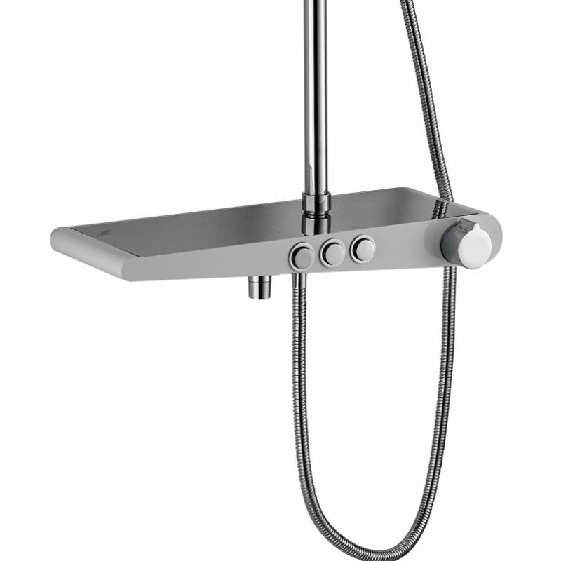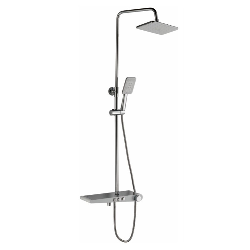 Душевая система Haiba. Изготовлена из высококачественной латуни. Прекрасный тропический душ. Излив для наполнения ванны. Оснащается полкой для гигиенический средств. Душевая штанга регулируется по высоте от 93,7 см до 153,7 см. Переключение потоков осуществляется путем нажатия кнопок на корпусе смесителя.