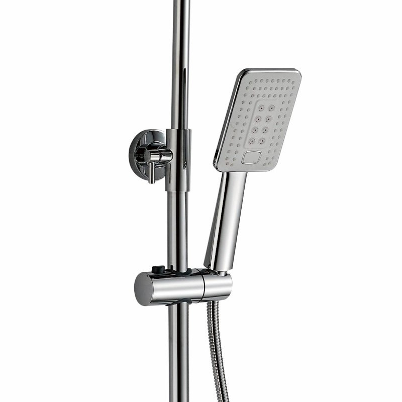Комплектация: верхний душ, душевая штанга, держатель душевой лейки, ручной душ, смеситель, шланг;