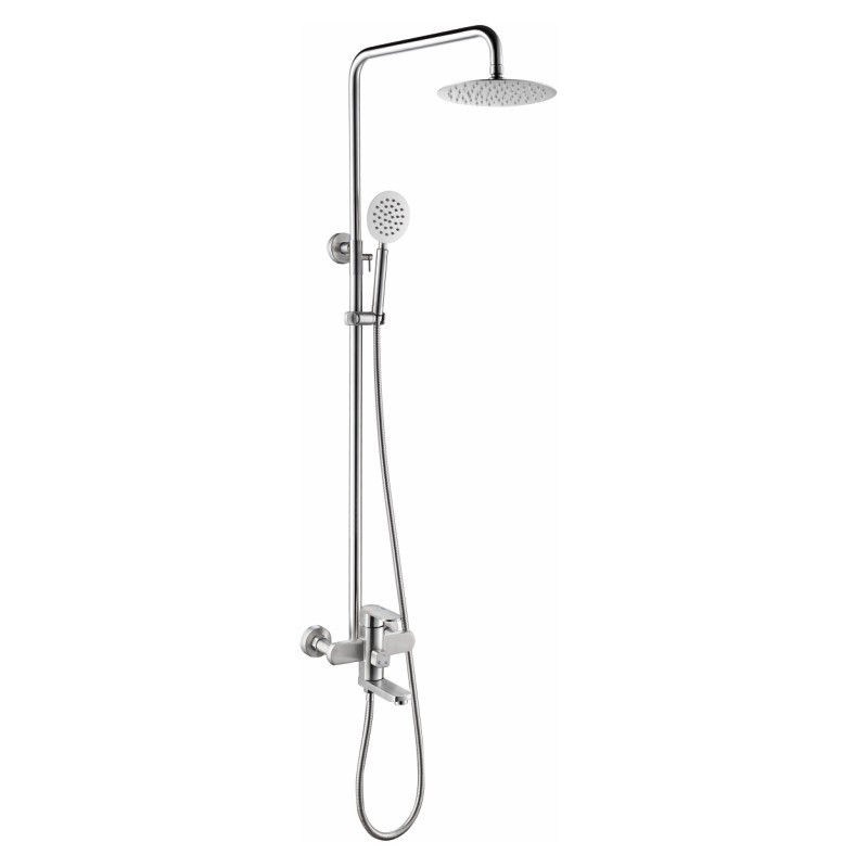 Комплектация: верхний душ, душевая штанга, держатель душевой лейки, ручной душ, смеситель, шланг;