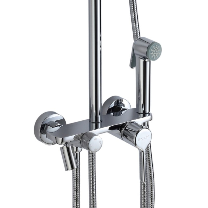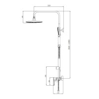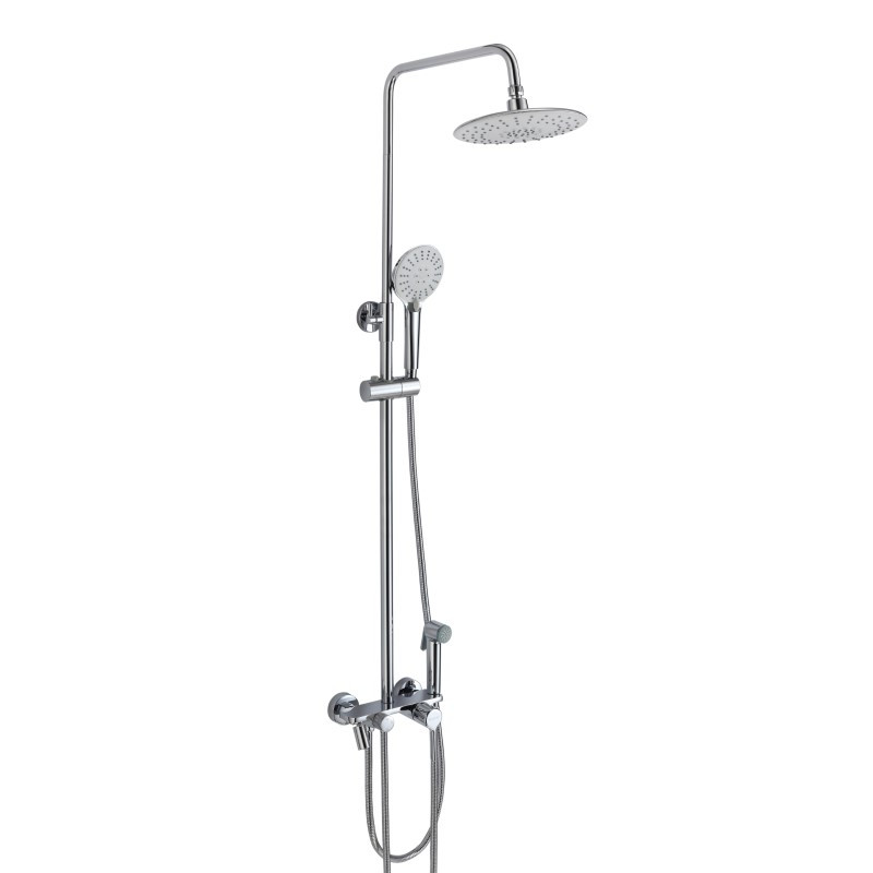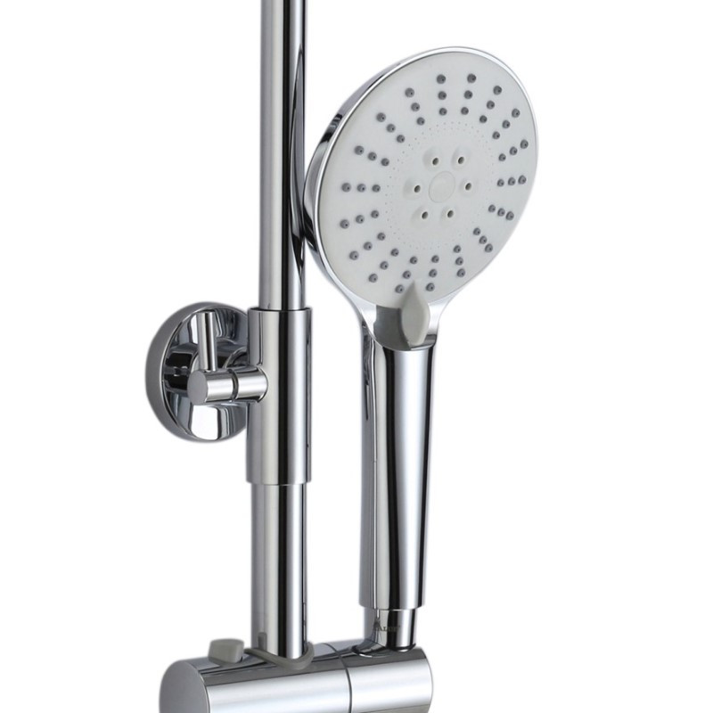 Комплектация: верхний душ, душевая штанга, держатель душевой лейки, ручной душ, смеситель, шланг;
