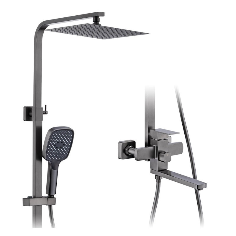 Комплектация: верхний душ, душевая штанга с держателем лейки, ручной душ, смеситель, шланг;