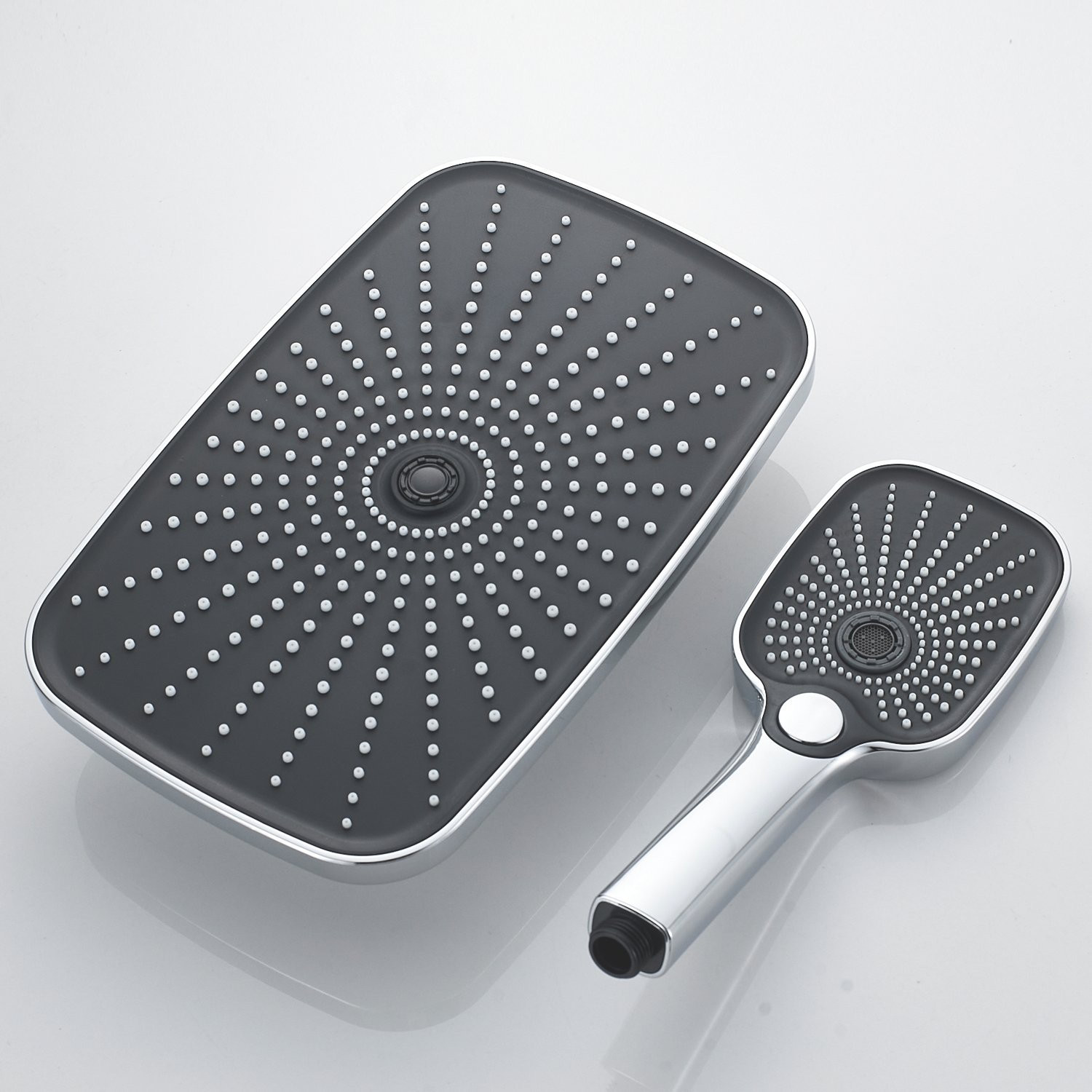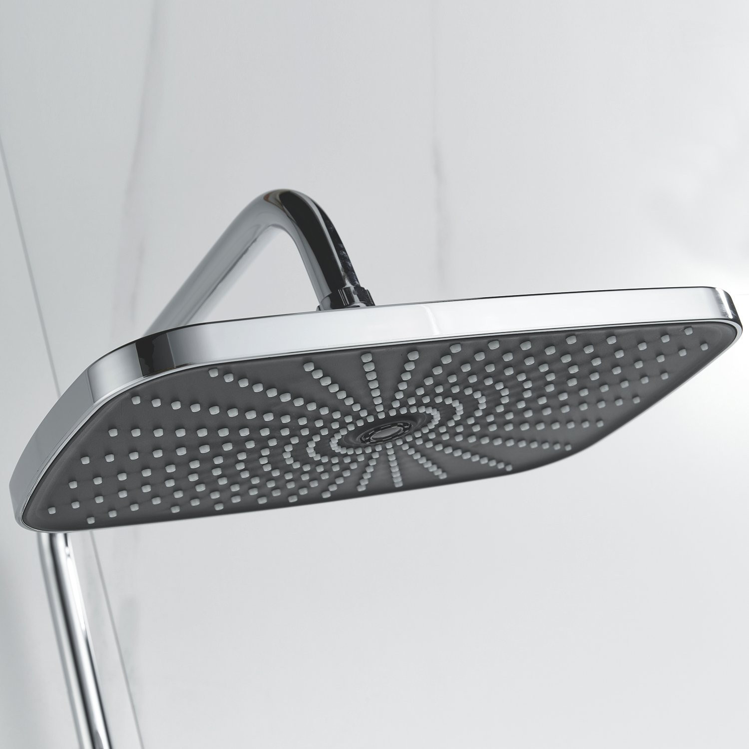 Верхний душ размером 300x190 мм из ABS-пластика регулируется по высоте благодаря телескопической штанге и по наклону с помощью встроенного шарнира, что обеспечивает максимальный комфорт и удобство использования. Самоочищающиеся силиконовые форсунки предотвращают образование известкового налета и сохраняют чистоту и силу потока воды.