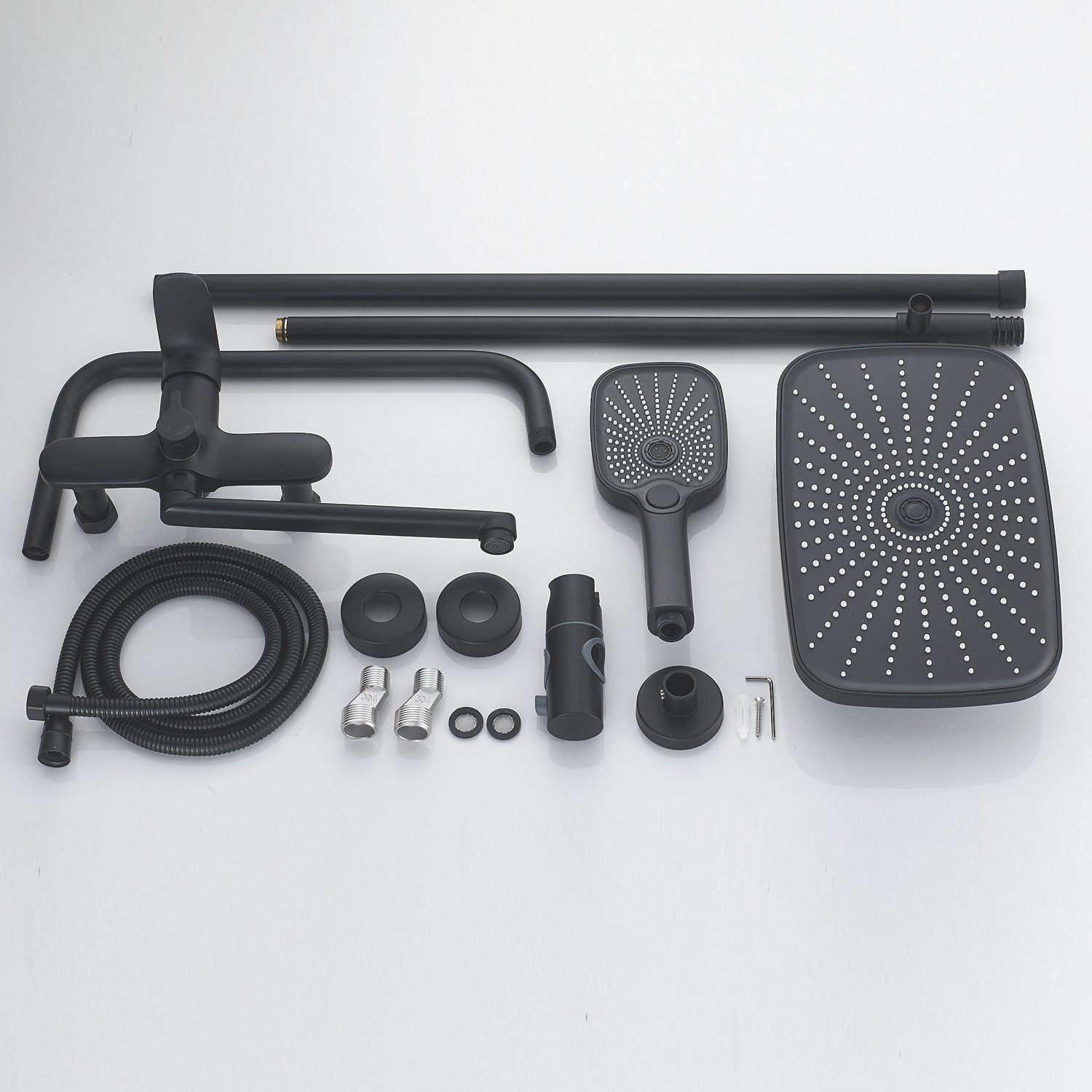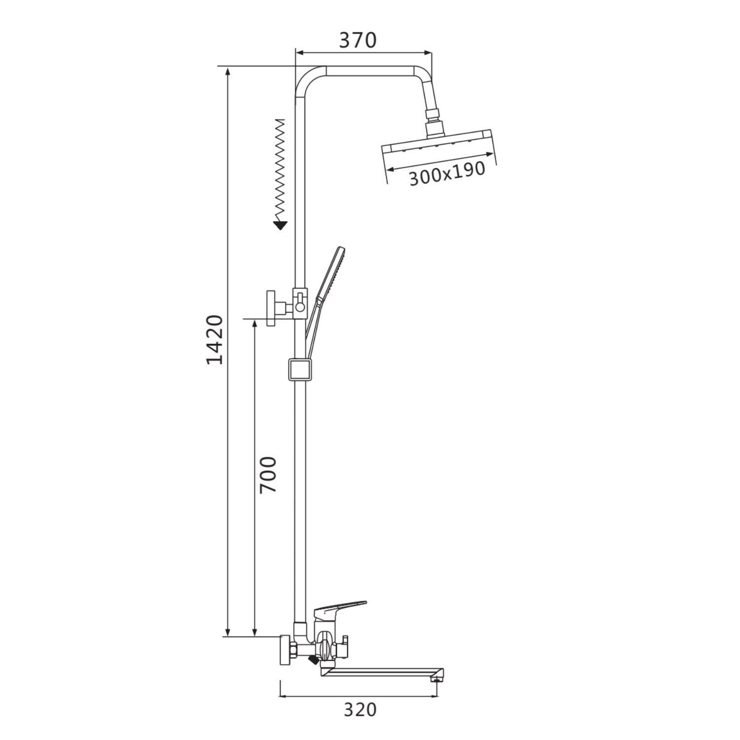 Верхний душ размером 300x190 мм из ABS-пластика регулируется по высоте благодаря телескопической штанге и по наклону с помощью встроенного шарнира, что обеспечивает максимальный комфорт и удобство использования. Самоочищающиеся силиконовые форсунки предотвращают образование известкового налета и сохраняют чистоту и силу потока воды.