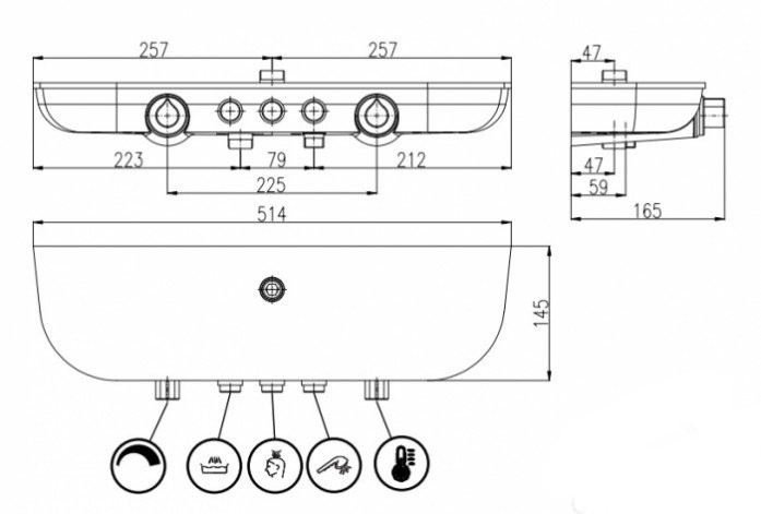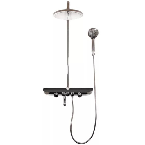 Комплектация: смеситель, душевой шланг, душевая лейка, штанга, верхний душ, инструкция;