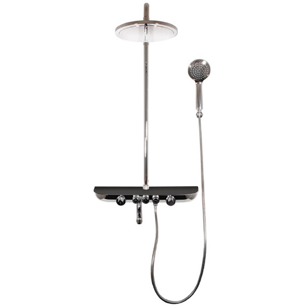 Комплектация: смеситель, душевой шланг, душевая лейка, штанга, верхний душ, инструкция;