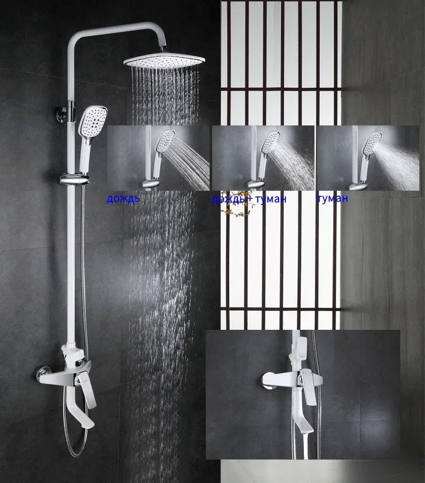 Душевая система Rose R1336F, белый/хром. Монтаж: настенный. Стилистика дизайна: современный стиль. Управление: рычажное. Размер верхнего душа: 26x20. Форма верхнего душа: прямоугольная.