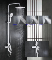 Комплектация: смеситель, верхний душ, штанга с держателем душевой лейки, душевая лейка, шланг, эксцентрики;