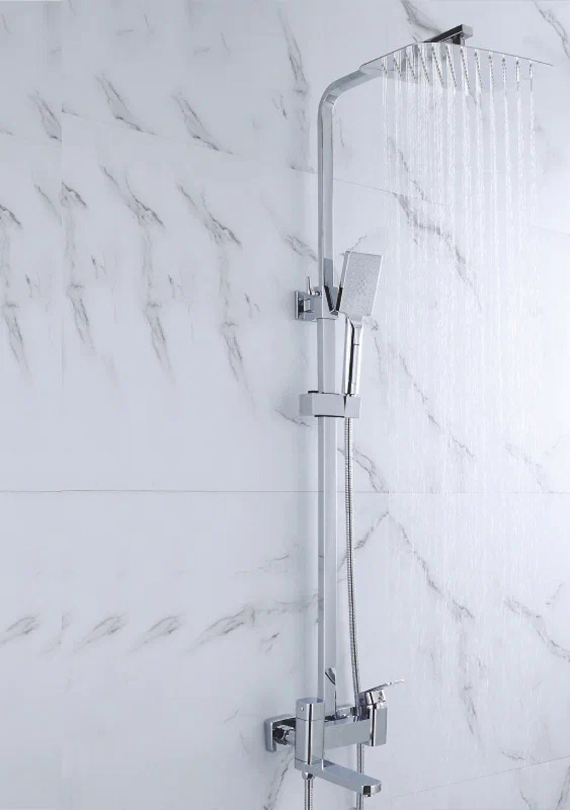 Комплектация: смеситель, верхний душ, штанга с держателем душевой лейки, душевая лейка, шланг, эксцентрики;