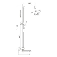Комплектация: смеситель, верхний душ, штанга с держателем душевой лейки, душевая лейка, шланг, эксцентрики;