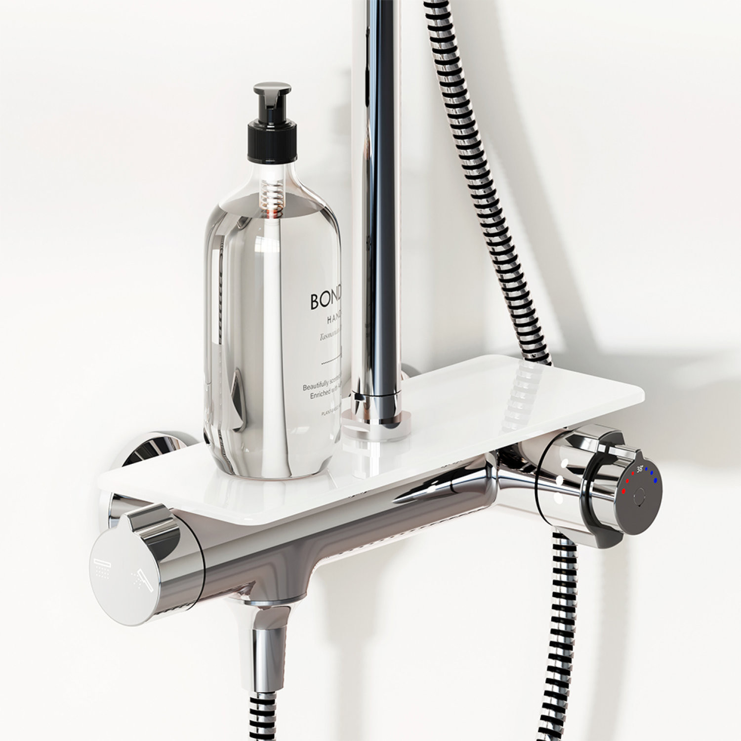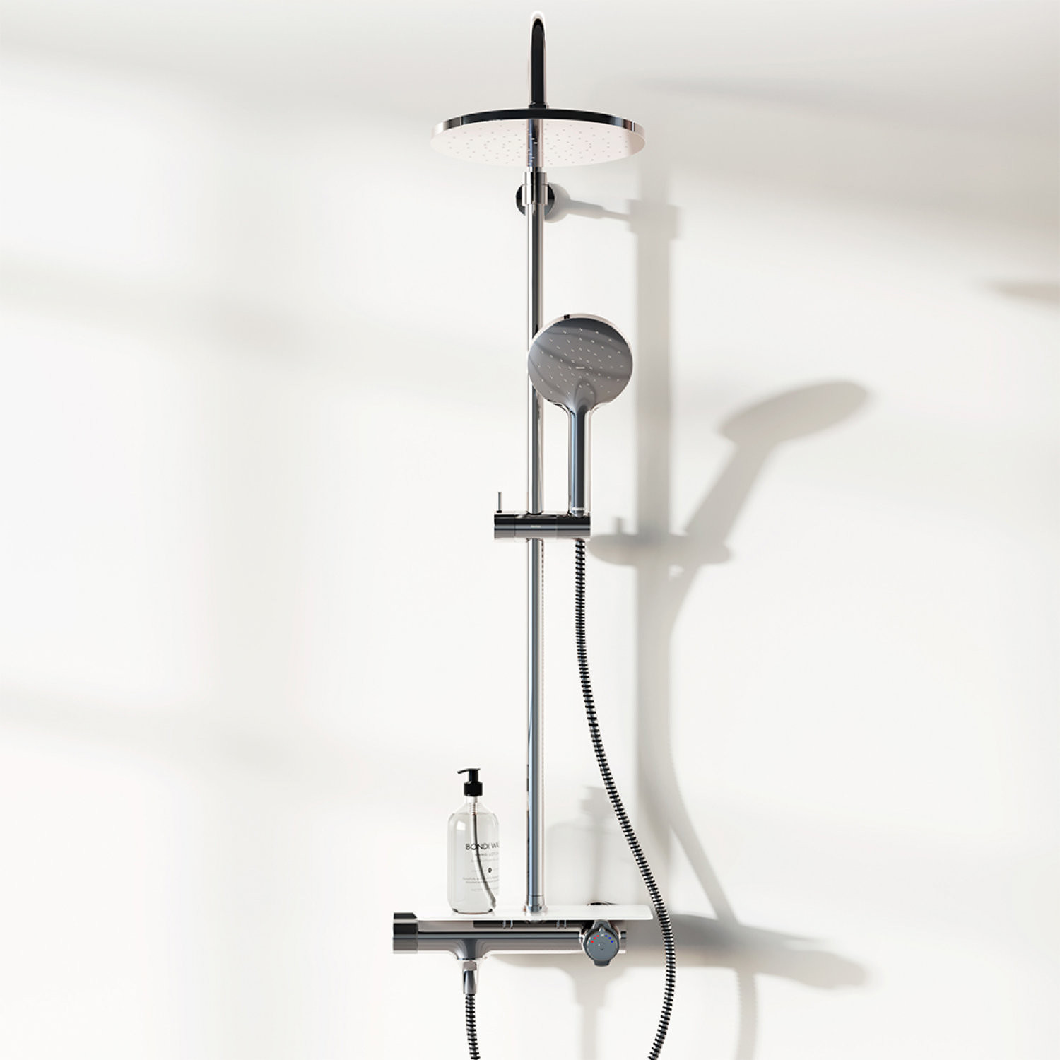 Стильный и лаконичный дизайн душевой системы Jupiter прекрасно подойдет как для классической, так и для современной ванной комнаты. Максимальная безопасность: термостатический картридж 35 мм обеспечивает точную настройку температуры и напора воды. Непревзойдённый комфорт и удобство: смеситель выполнен в виде компактной полочки, где вы можете хранить все необходимые вещи. Благодаря телескопической штанге с диапазоном регулировки 400 мм ежедневные процедуры будут одинаково комфортны для людей любого роста. Большое количество форсунок с микроотверстиями, которые распределяют поток мягкими равномерными струями, обеспечит вам расслабляющий эффект настоящего домашнего SPA. Переключайте потоки воды между ручной и тропической лейками плавным поворотом левой ручки смесителя, а между смесителем и ручной лейкой - поворотом излива на 90 градусов. Угол наклона тропической лейки можно регулировать. Инновационное покрытие High Gloss надежно защищает хромовую поверхность душевой системы от мелких повреждений и сохраняет ювелирный блеск на долгие годы. |
