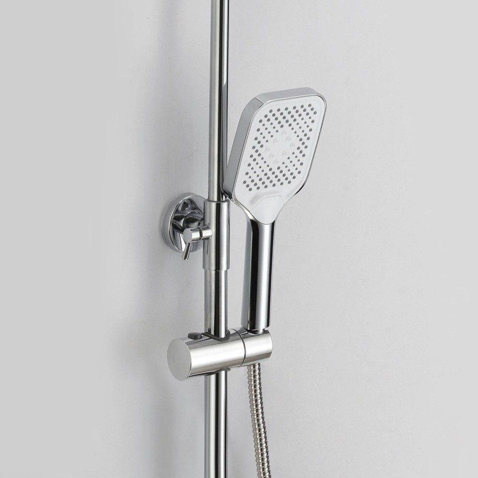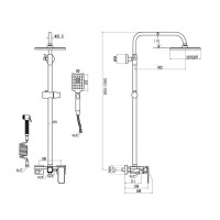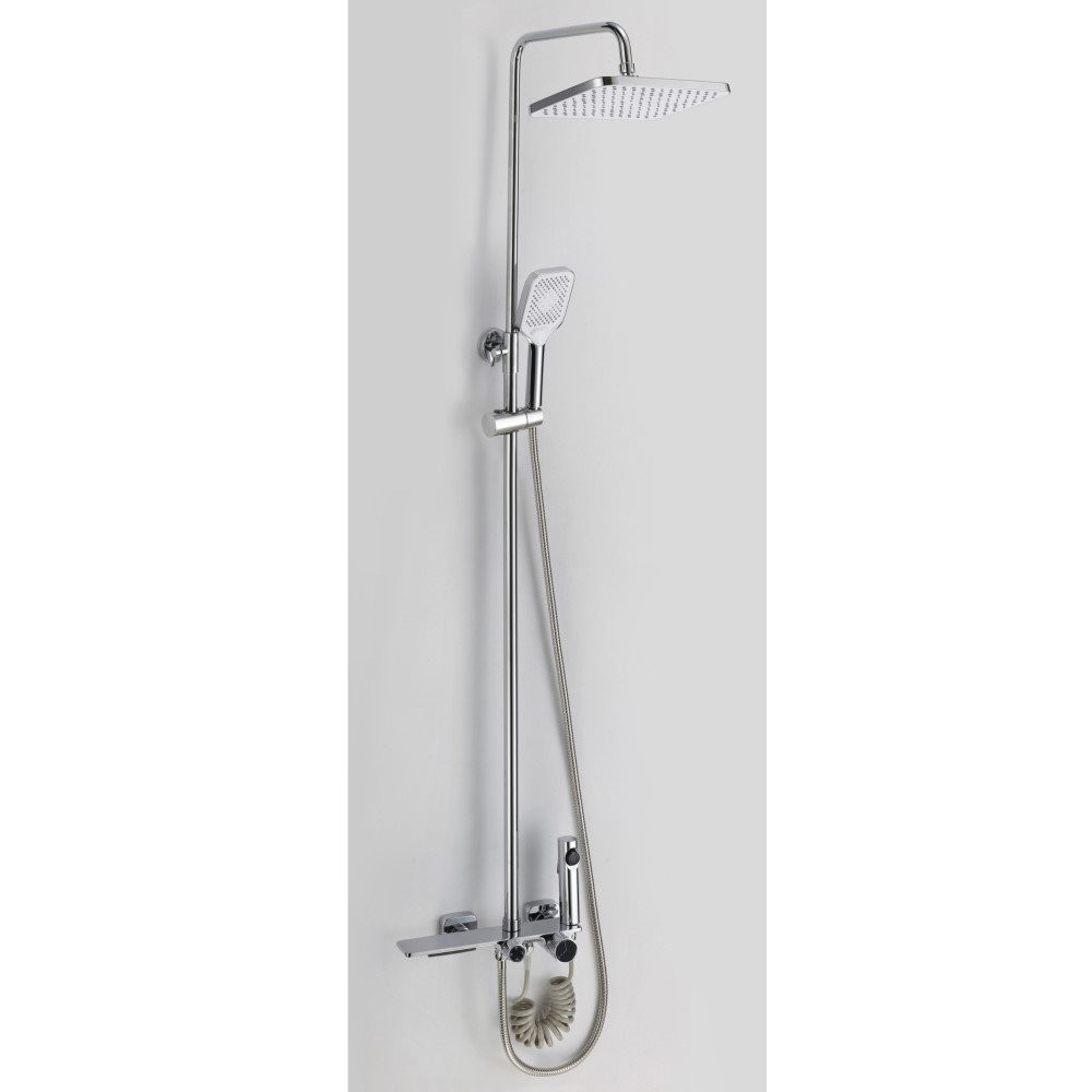 Душевая система D-Lin. Изготовлена из высококачественной нержавеющей стали. Тропический душ квадратной формы имеет оптимальный размер 20х20 см., легко очищается благодаря силиконовым форсункам. Компактный излив для наполнения ванны регулирует угол наклона благодаря шарниру.. Душевая штанга регулируется по высоте от 85 см до 139 см. Душевая система оснащена гигиеническим душем.