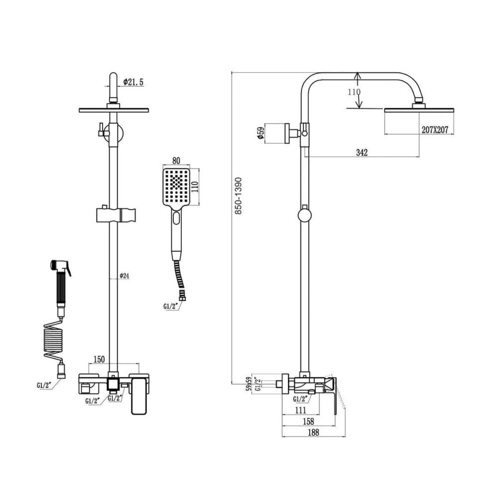 Комплектация: верхний душ, душевая штанга, держатель душевой лейки, ручной душ, смеситель, шланг, гигиеническая лайка, шланг гигиенической лейки, эксцентрики, декоративные чашки;