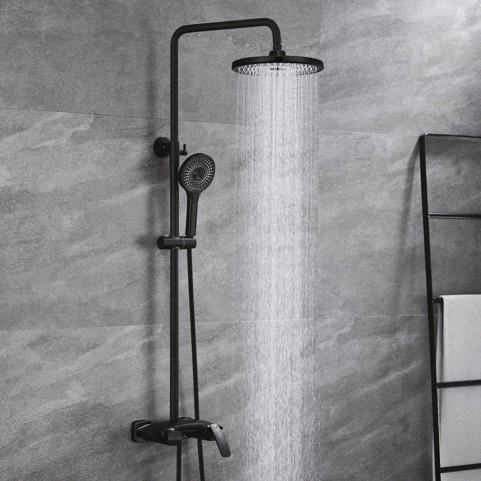 Душевая система с каскадным изливом Rose R1136H, черный. Монтаж: настенный. Стилистика дизайна: современный стиль. Управление: рычажное. Размер верхнего душа: 25x25. Форма верхнего душа: круглая.