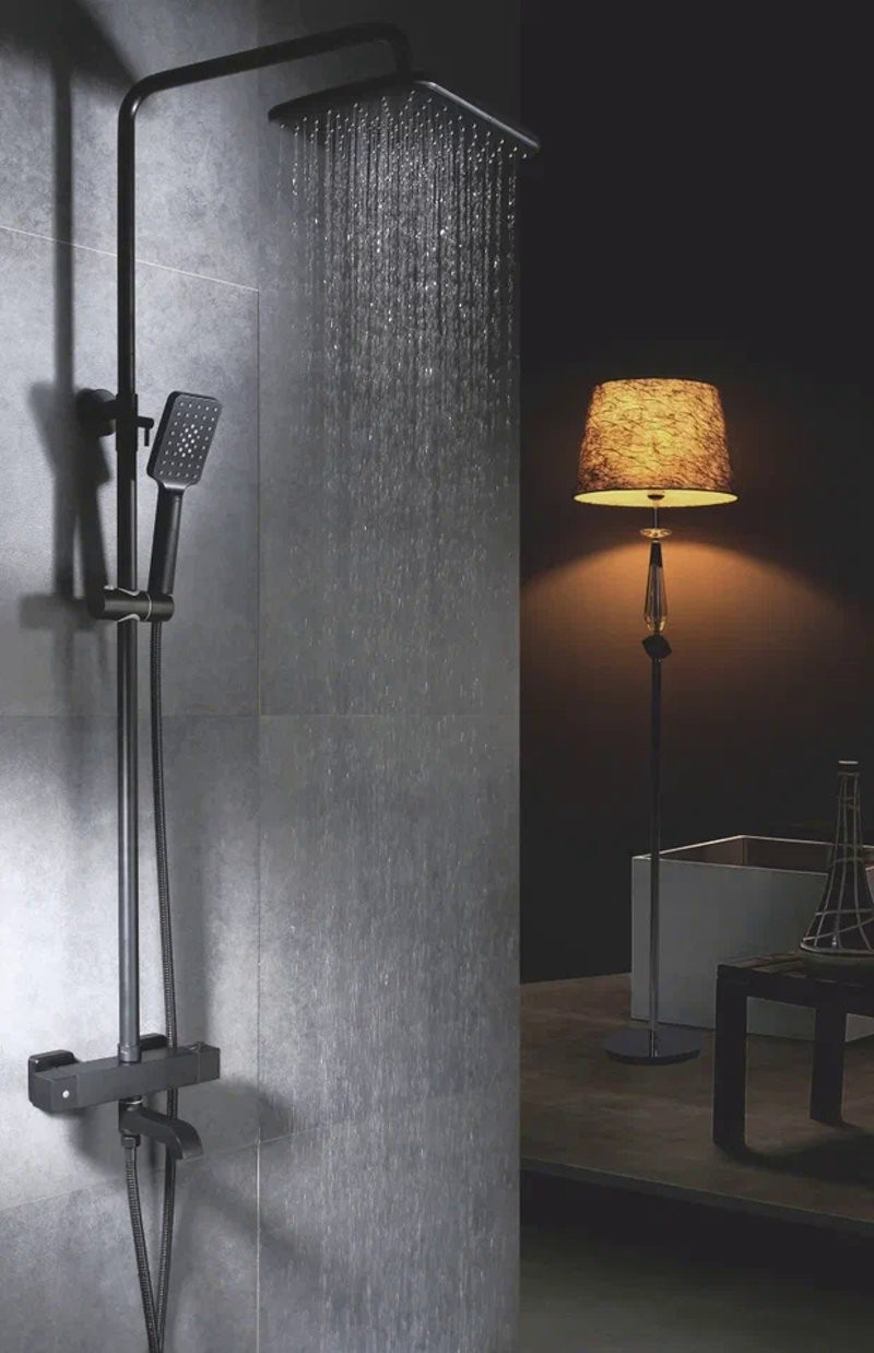 Душевая система с термостатом Rose R3536H, черный. Монтаж: настенный. Стилистика дизайна: современный стиль. Управление: термостат. Размер верхнего душа: 30x20. Форма верхнего душа: прямоугольная.