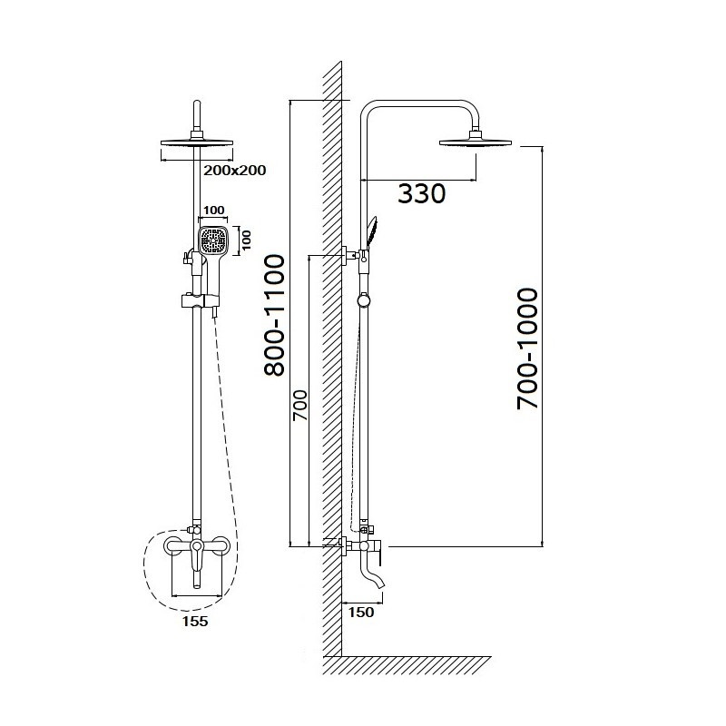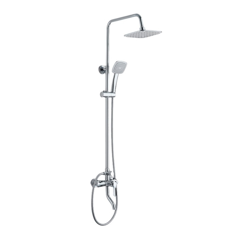 Комплектация: верхний душ, душевая штанга, держатель душевой лейки, ручной душ, смеситель, шланг;