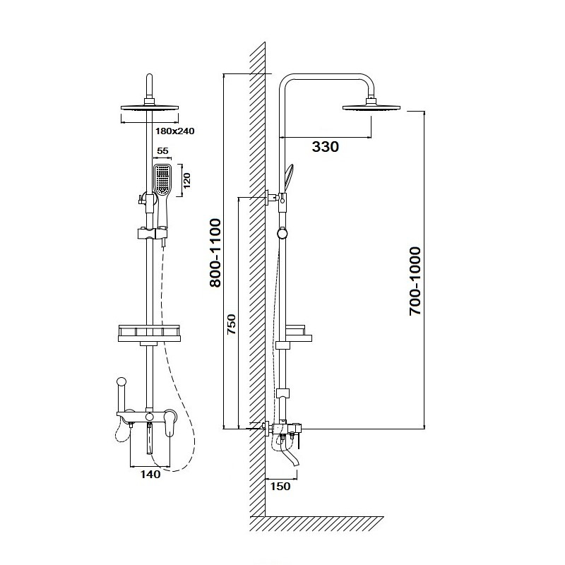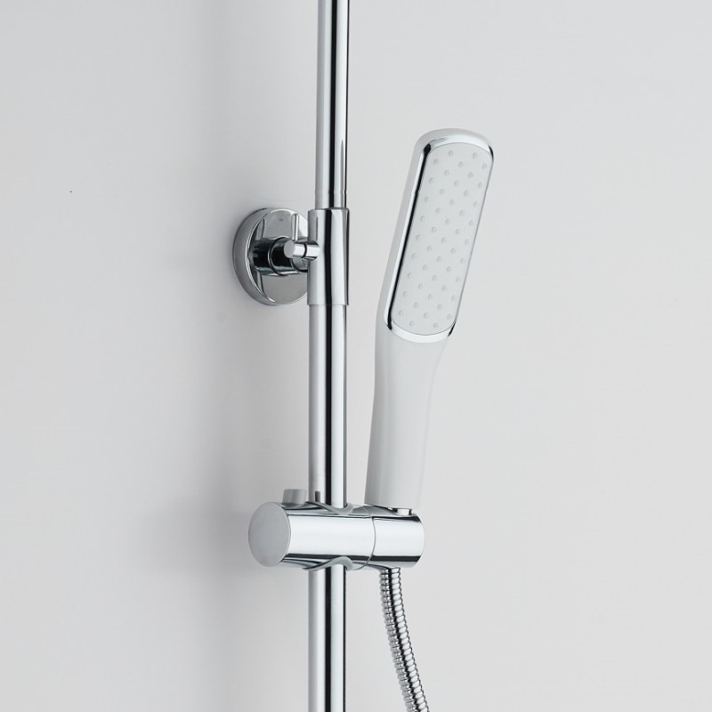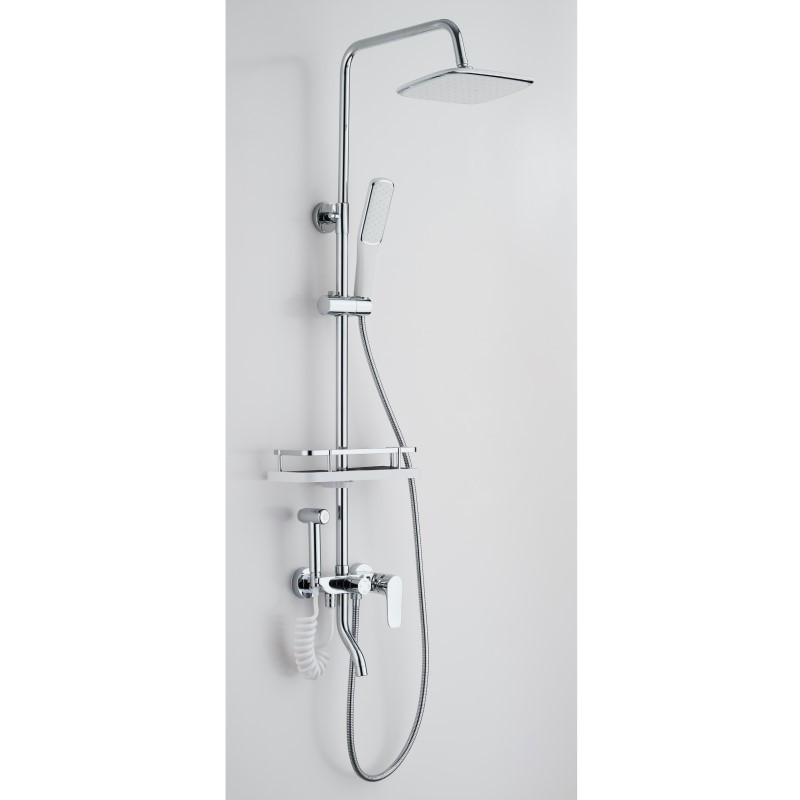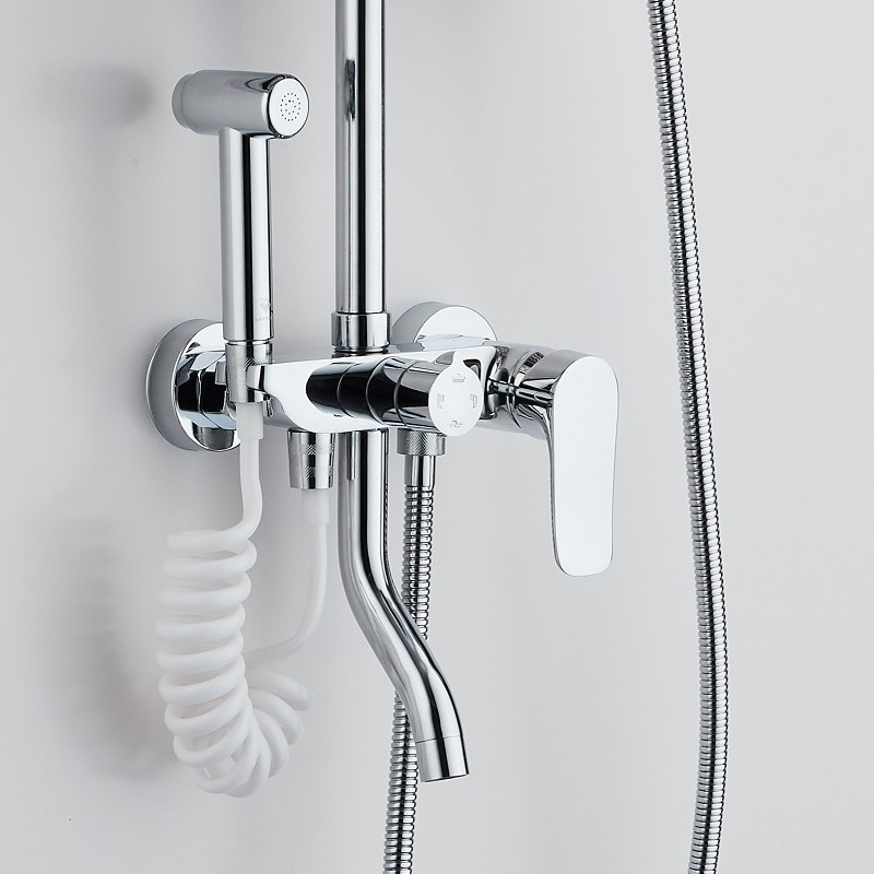 Комплектация: верхний душ, душевая штанга, держатель душевой лейки, ручной душ, смеситель, шланг, гигиеническая лейка;
