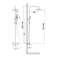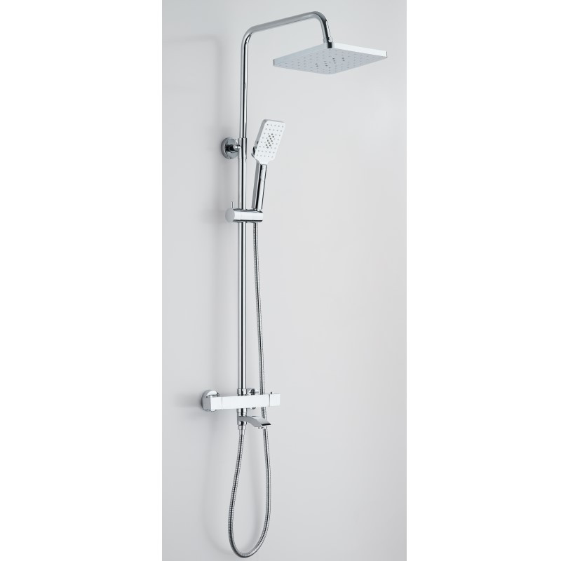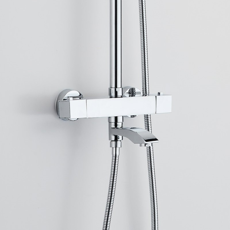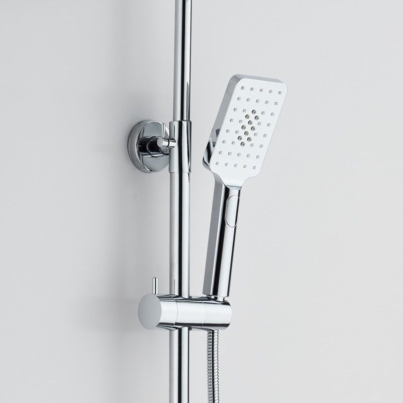 Комплектация: верхний душ, душевая штанга, держатель душевой лейки, ручной душ, смеситель, шланг;