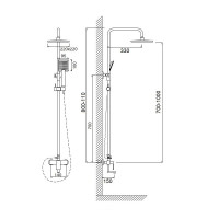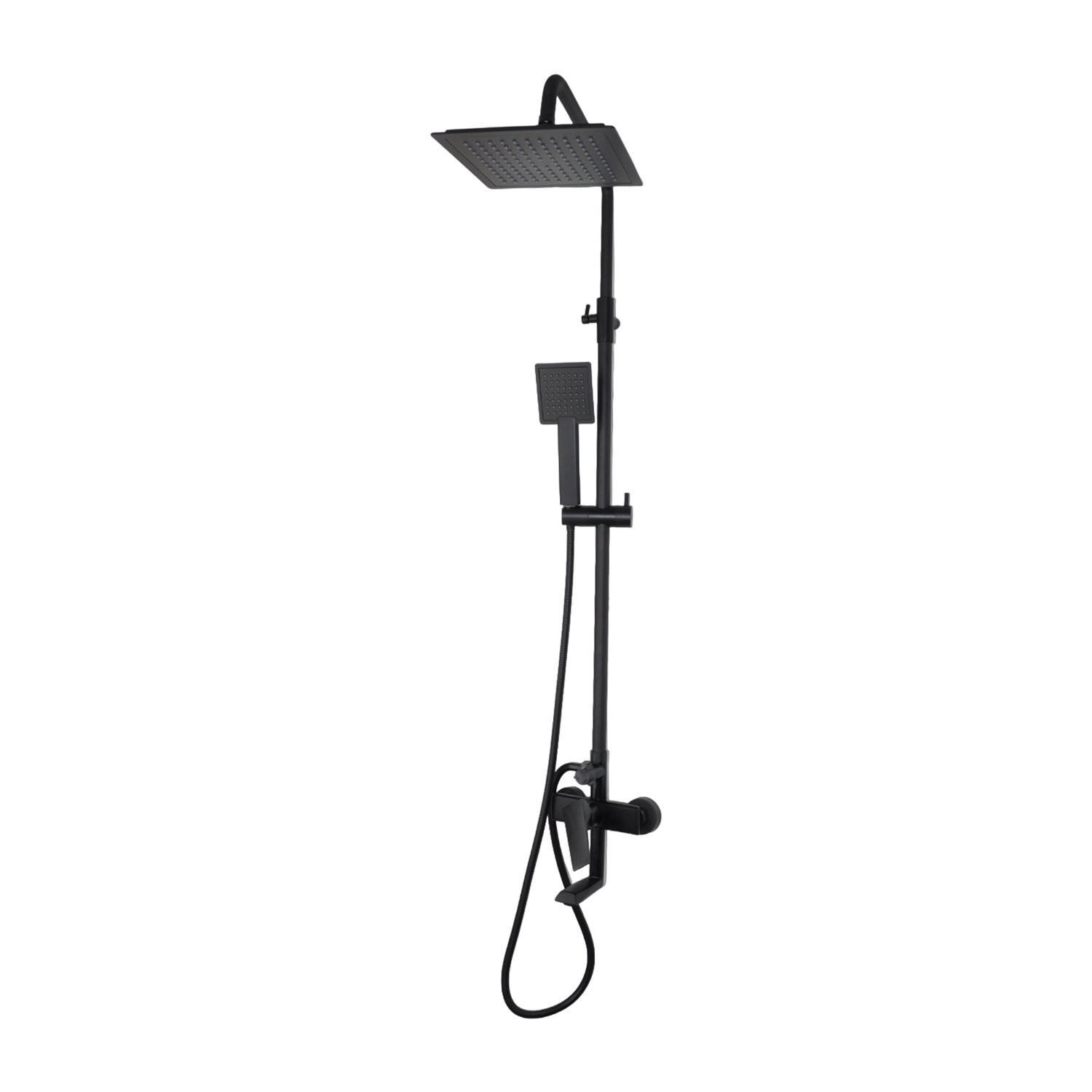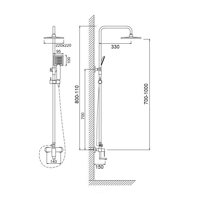 Комплектация: верхний душ, душевая штанга, держатель душевой лейки, ручной душ, смеситель, шланг;