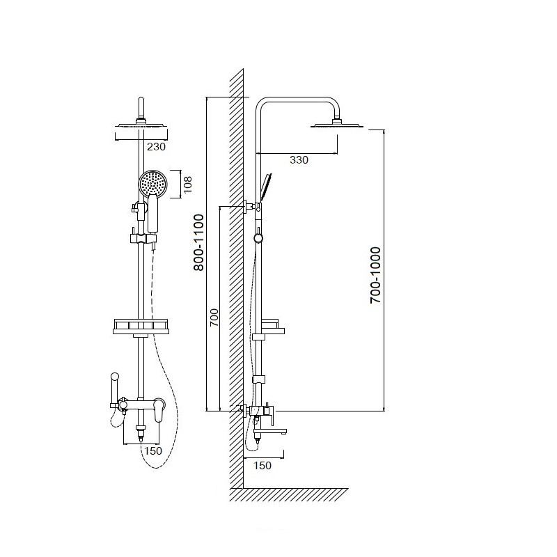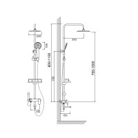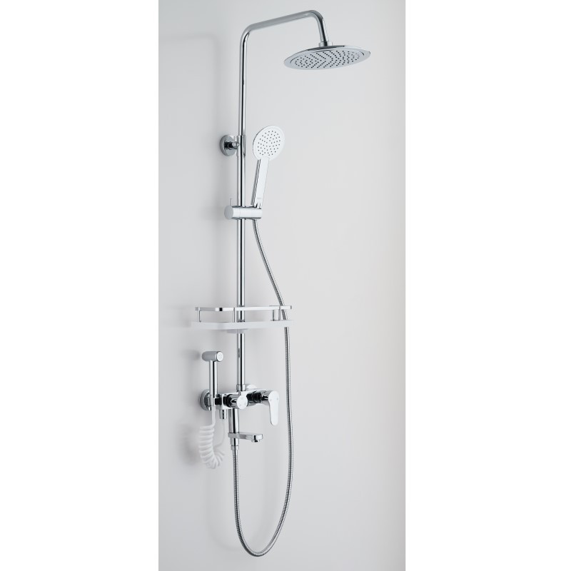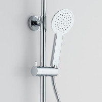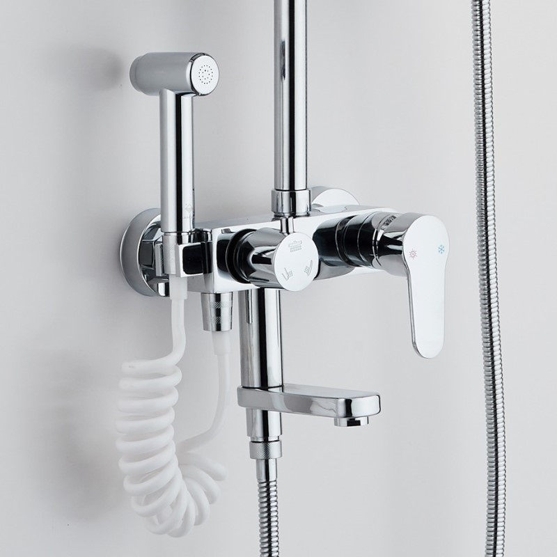 Комплектация: верхний душ, душевая штанга, держатель душевой лейки, ручной душ, смеситель, шланг, гигиеническая лейка;