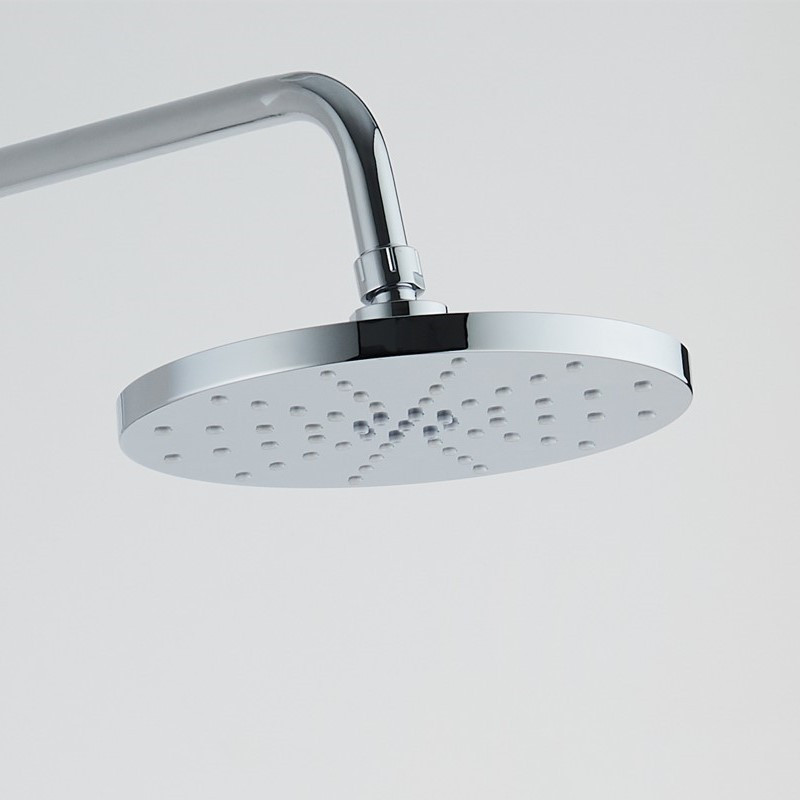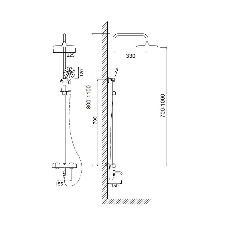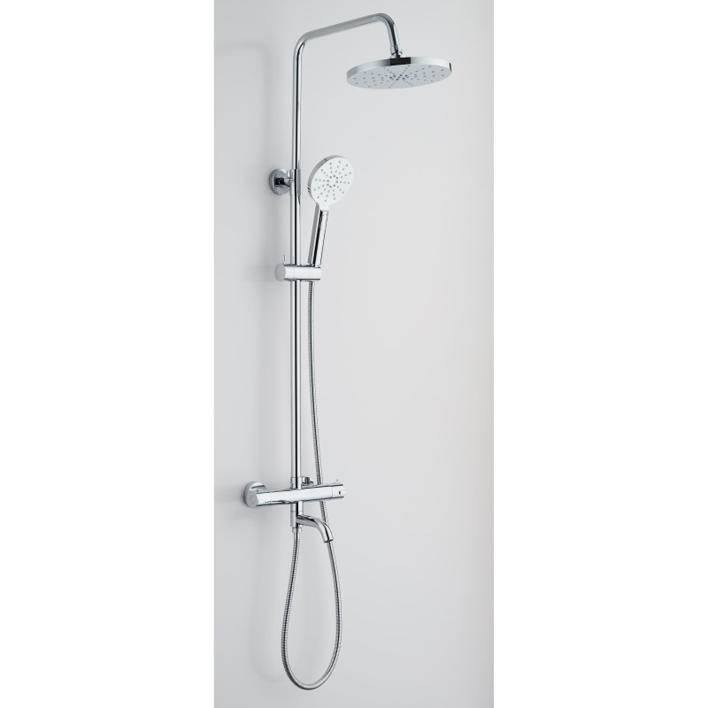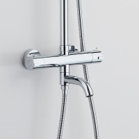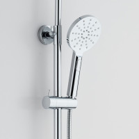 Комплектация: верхний душ, душевая штанга, держатель душевой лейки, ручной душ, смеситель, шланг;
