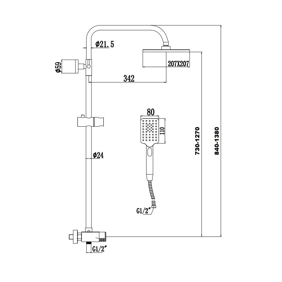 Душевая стойка Savol S-601144. Форма верхнего душ: квадратная. Размер верхнего душ: 207х207 мм. Вынос верхнего душа: 342 мм. Форма ручного душа: прямоугольная. Размер головки ручного душа: 80х110 мм. Регулируемый держатель ручного душа: да. Регулируемая высота стойки: да. Длина шланга: 1500 мм.