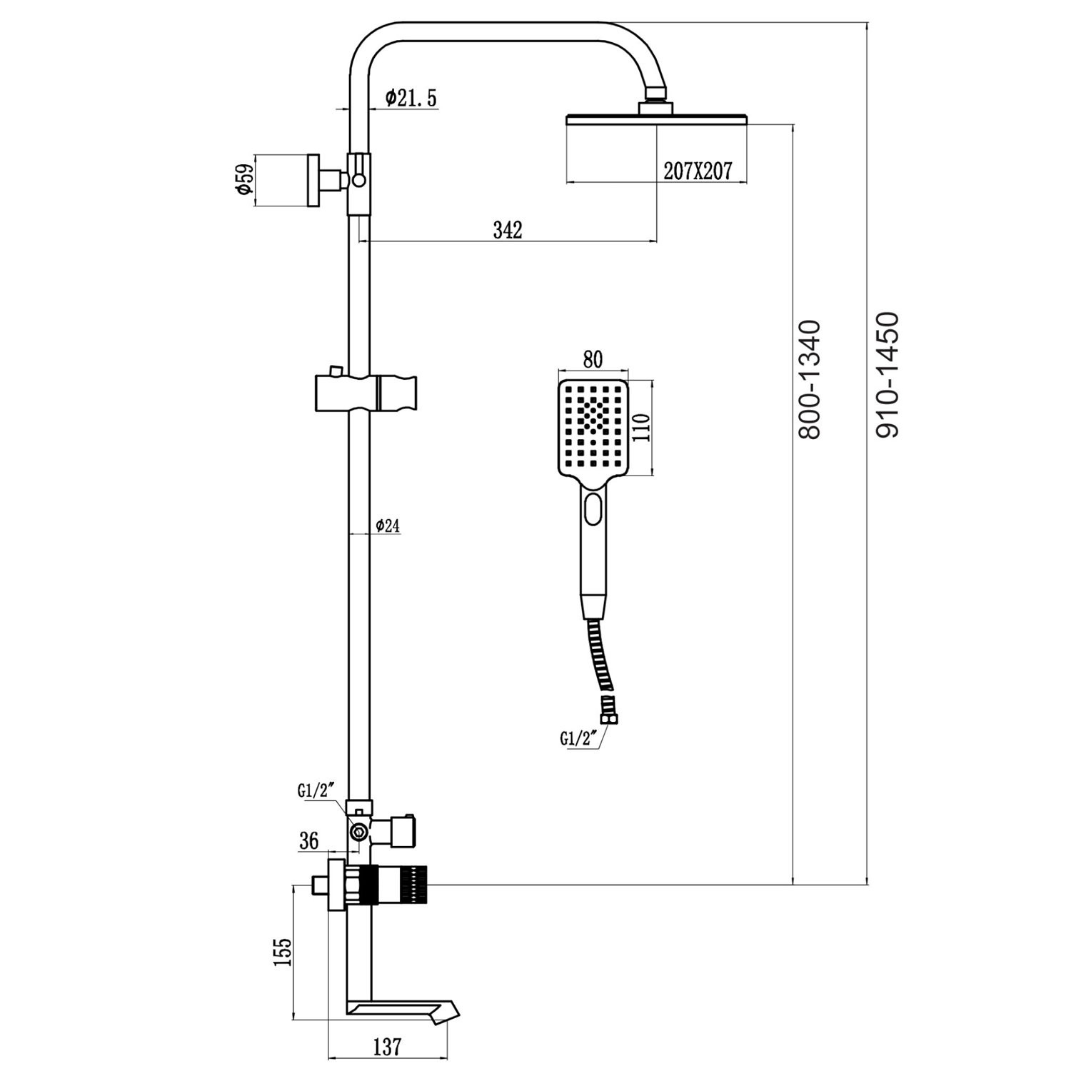 Душевая стойка Savol S-602242-1. Форма верхнего душ: квадратная. Размер верхнего душ: 207х207 мм. Вынос верхнего душа: 342 мм. Форма ручного душа: прямоугольная. Размер головки ручного душа: 80х110 мм. Аэратор: да. Регулируемый держатель ручного душа: да. Регулируемая высота стойки: да. Высота штанги: 1450 мм. Излив: да. Длина излива: 137 мм. Длина шланга: 1500 мм.