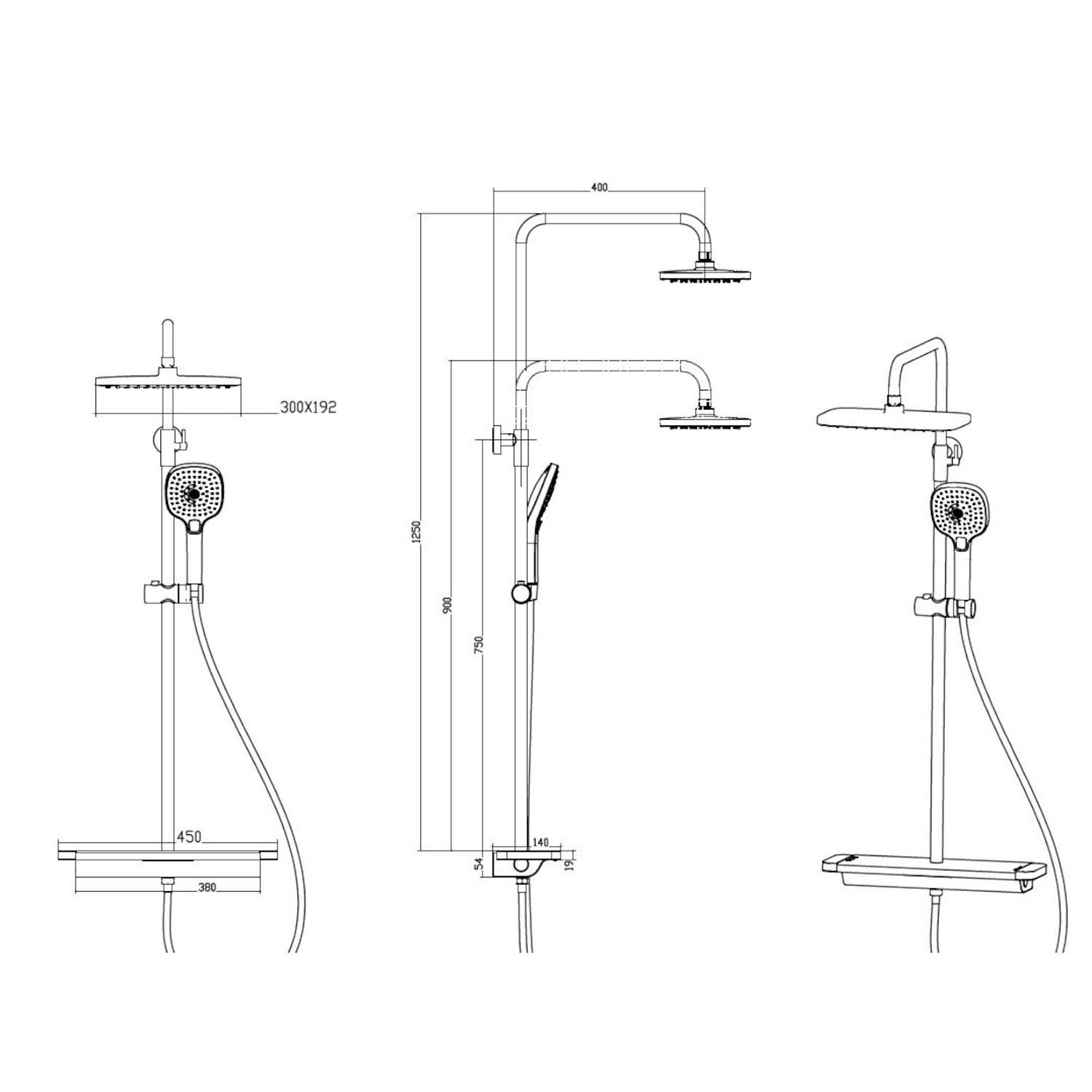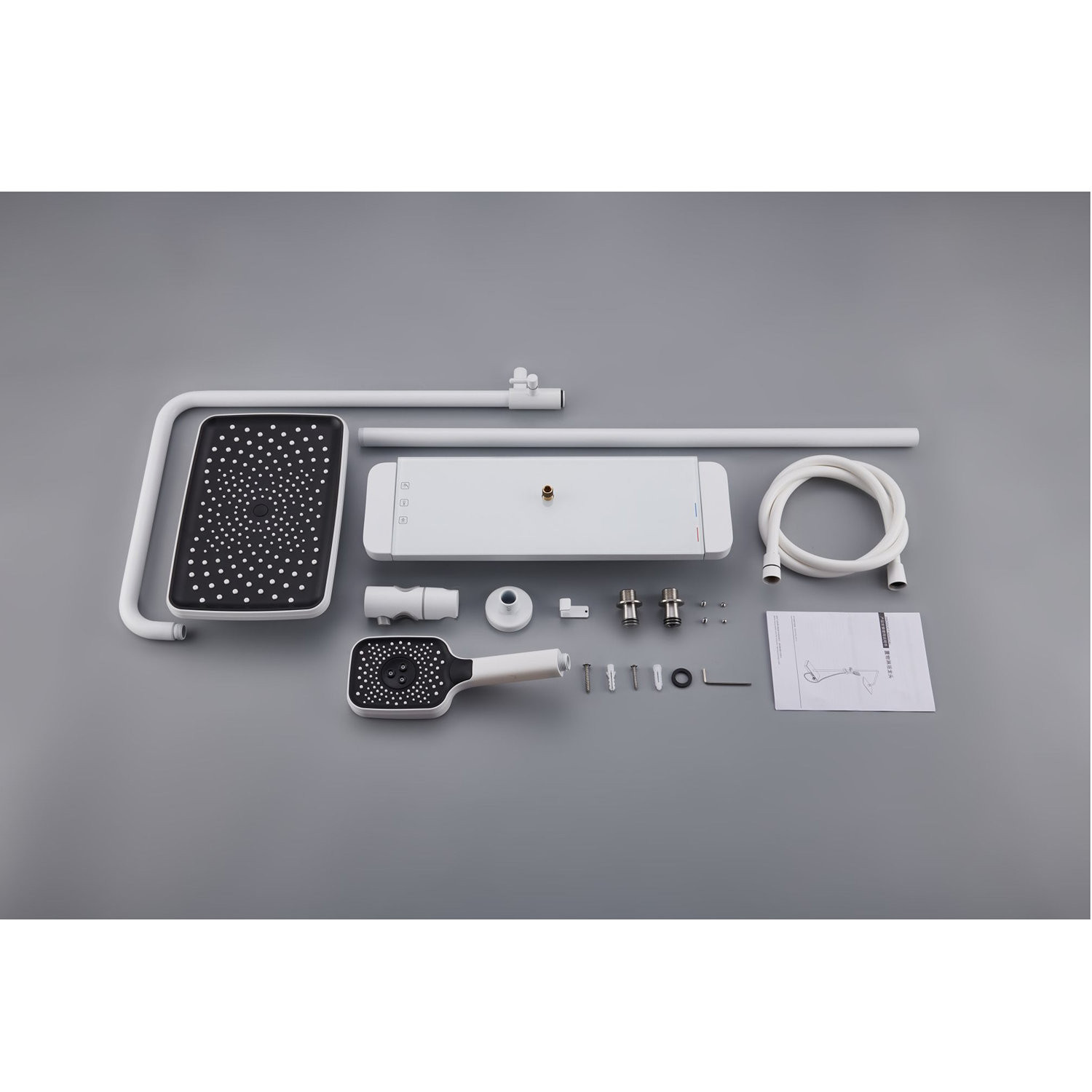 Комплектация: верхний душ, душевая штанга с держателем лейки, ручной душ, смеситель, шланг;