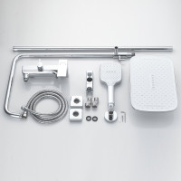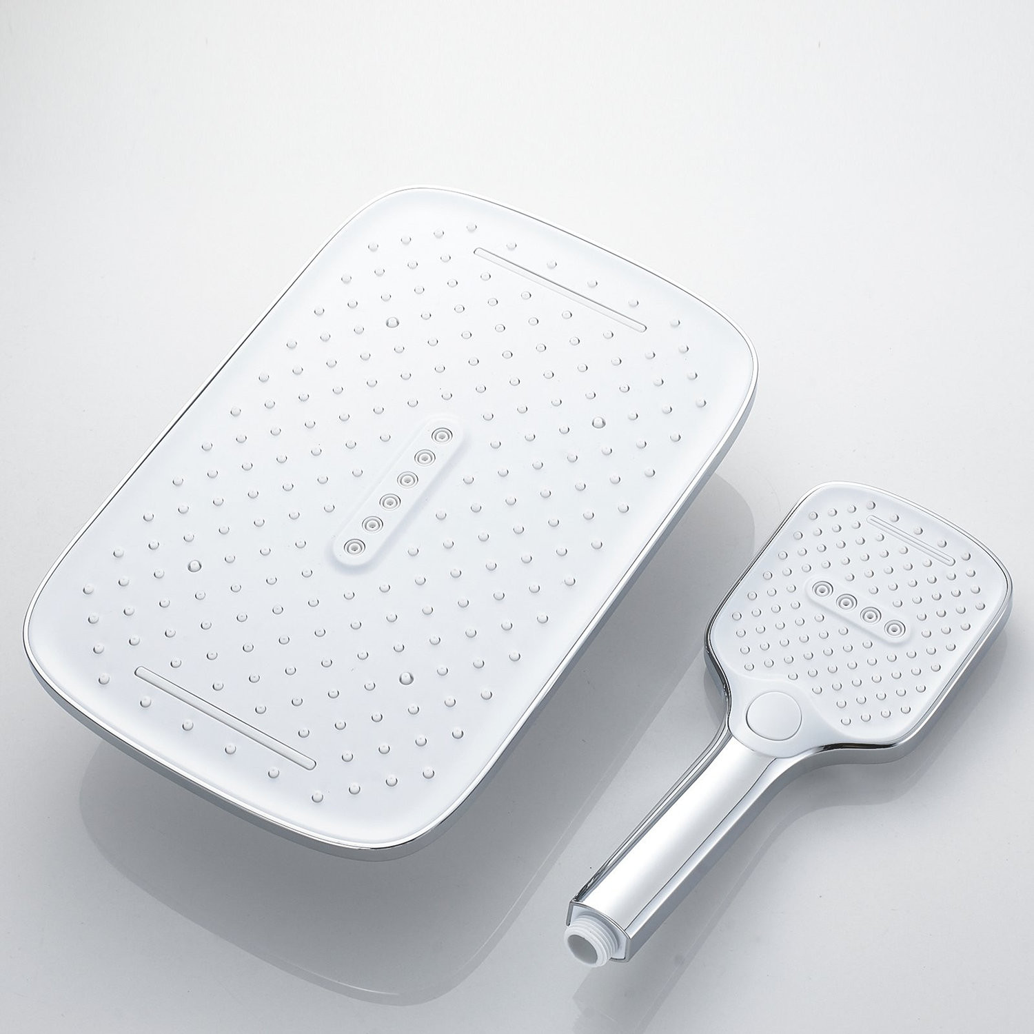 Верхний душ размером 310x210 мм из ABS-пластика легко регулируется по наклону благодаря встроенному шарниру. Он также оснащен самоочищающимися силиконовыми форсунками, которые защищают его от известкового налета, обеспечивая всегда чистый и сильный поток воды.