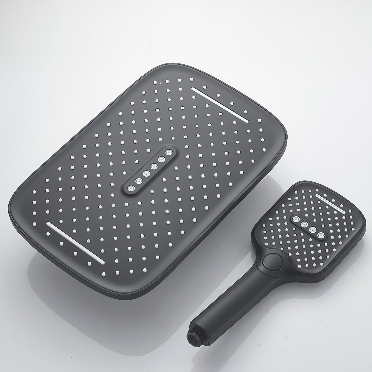 Верхний душ размером 310x210 мм из ABS-пластика легко регулируется по наклону благодаря встроенному шарниру. Он также оснащен самоочищающимися силиконовыми форсунками, которые защищают его от известкового налета, обеспечивая всегда чистый и сильный поток воды.