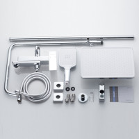 Центральным элементом композиции выступает внушительный верхний душ размером 320x210 мм, созданный из первоклассного ABS-пластика. Его инновационные силиконовые форсунки с функцией самоочистки и встроенной защитой от известковых отложений обеспечивают постоянный мощный поток воды. Благодаря встроенному шарниру вы можете легко настроить оптимальный угол наклона для максимального комфорта.