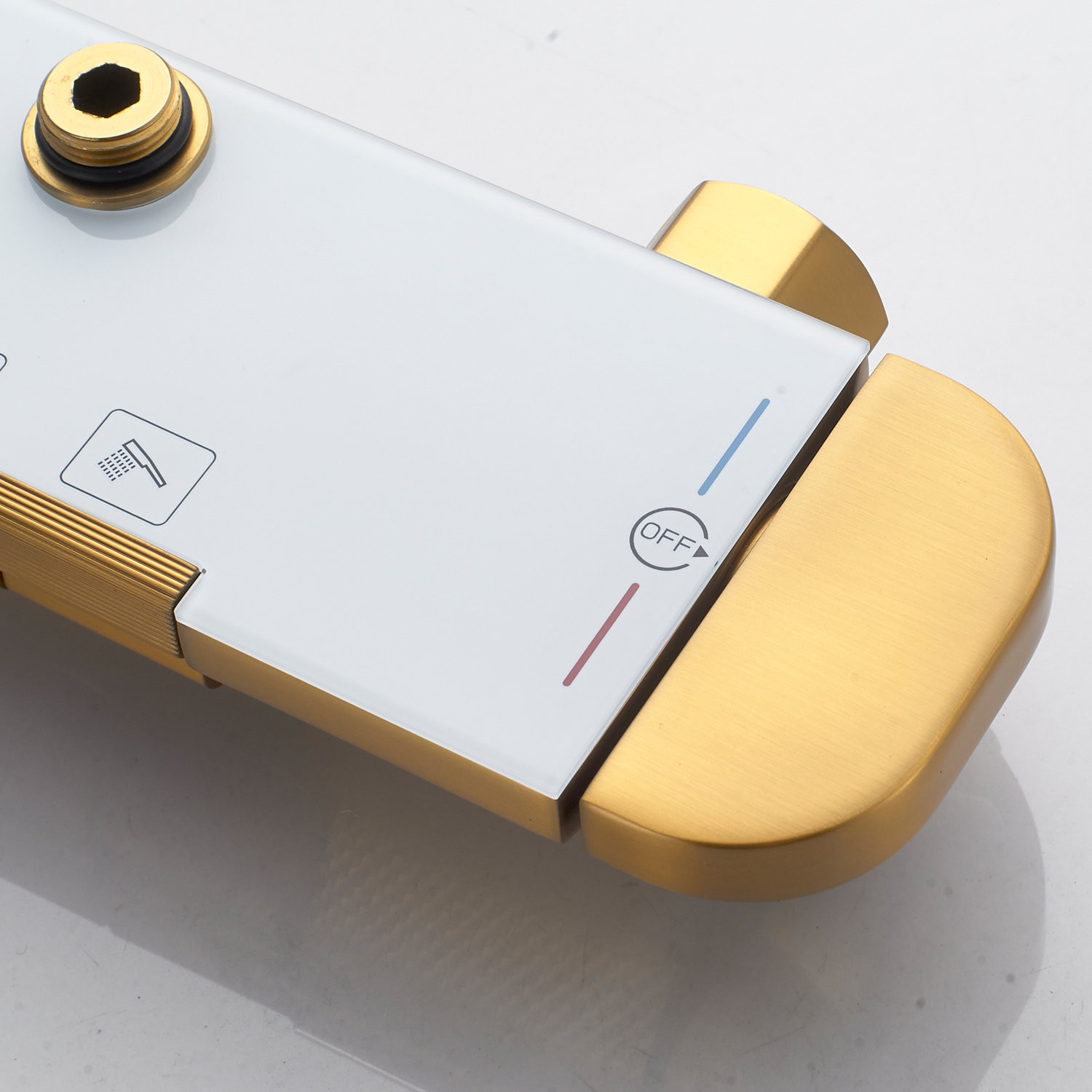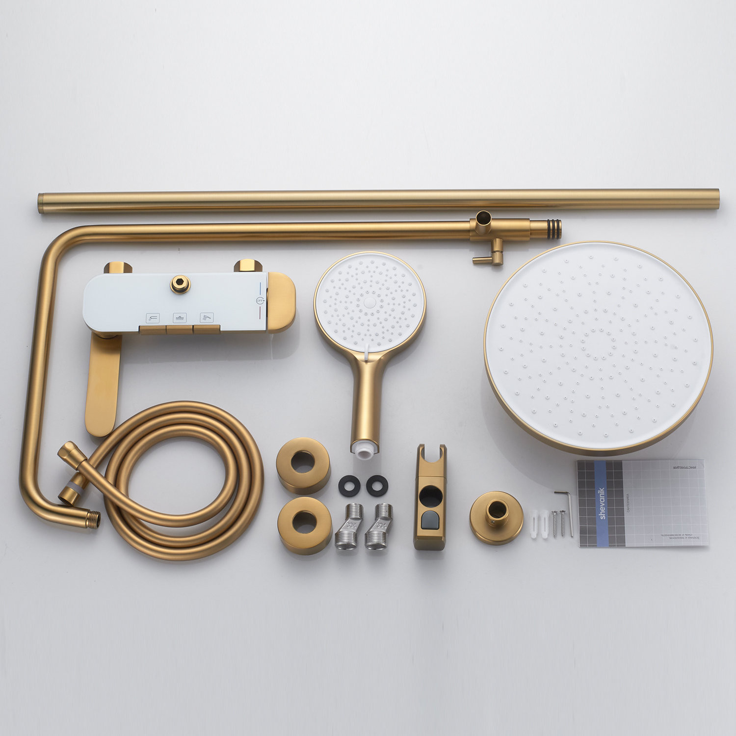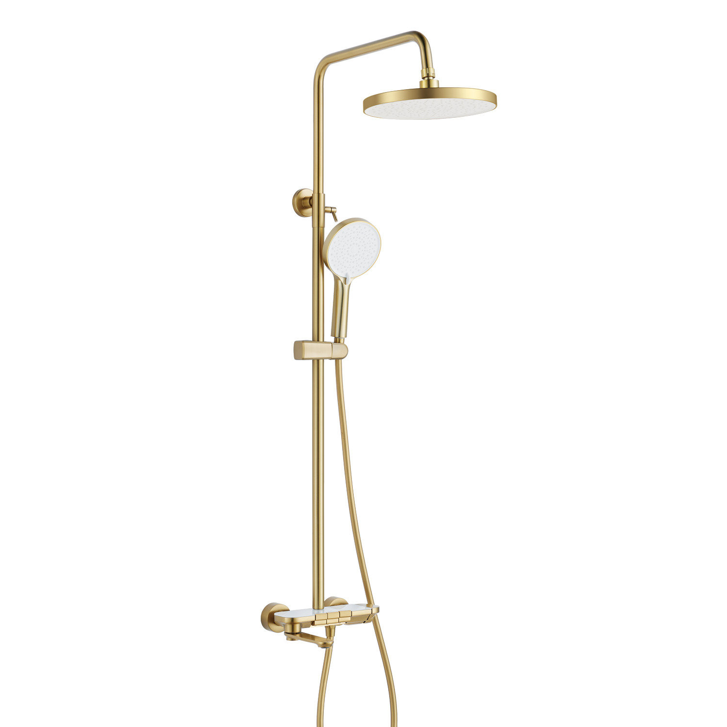 Элегантная душевая система Shevanik S4726G в цвете "золотой сатин" (сатинированное золото) воплощает в себе современный дизайн и безупречное качество исполнения. Изготовленная из прочной латуни, она гарантирует долговечность и надежность в использовании.