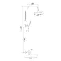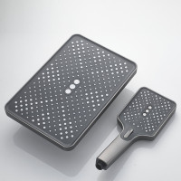 Верхний душ размером 305x205 мм из ABS-пластика регулируется по высоте благодаря телескопической штанге и по наклону с помощью встроенного шарнира, что обеспечивает максимальный комфорт и удобство использования. Самоочищающиеся силиконовые форсунки предотвращают образование известкового налета и сохраняют чистоту и силу потока воды.