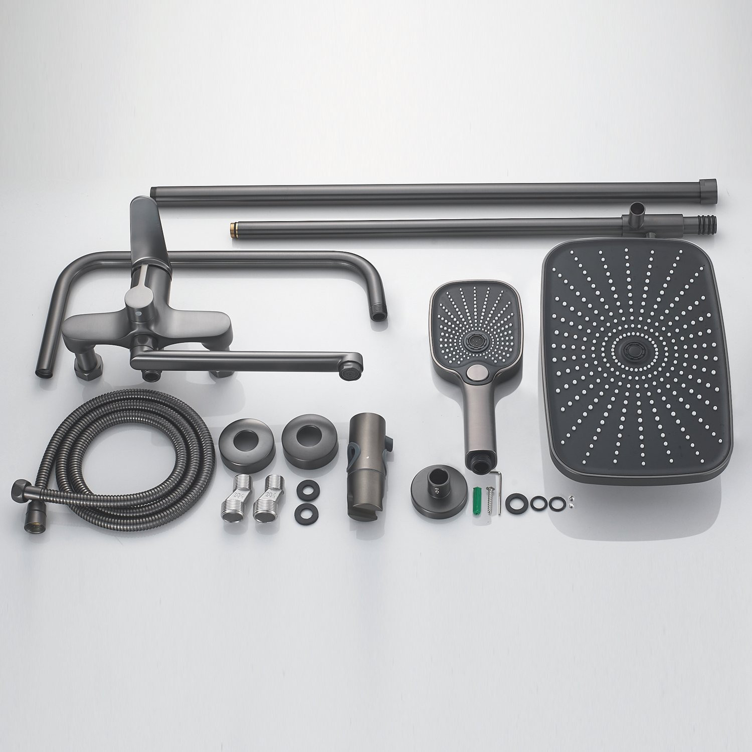 Комплектация: смеситель, верхний душ, штанга, лейка, шланг, эксцентрики, декоративные чашки;