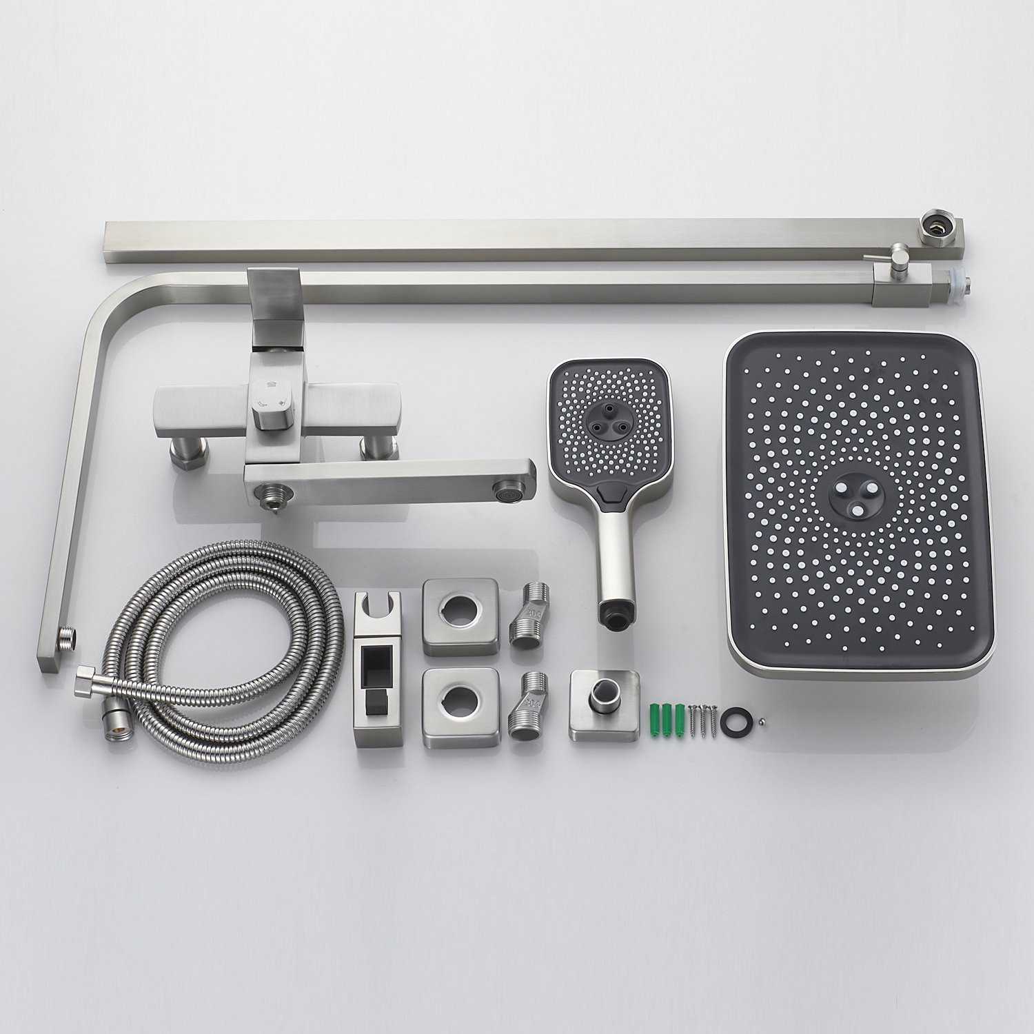 Комплектация: смеситель, верхний душ, штанга, лейка, шланг, эксцентрики, декоративные чашки;