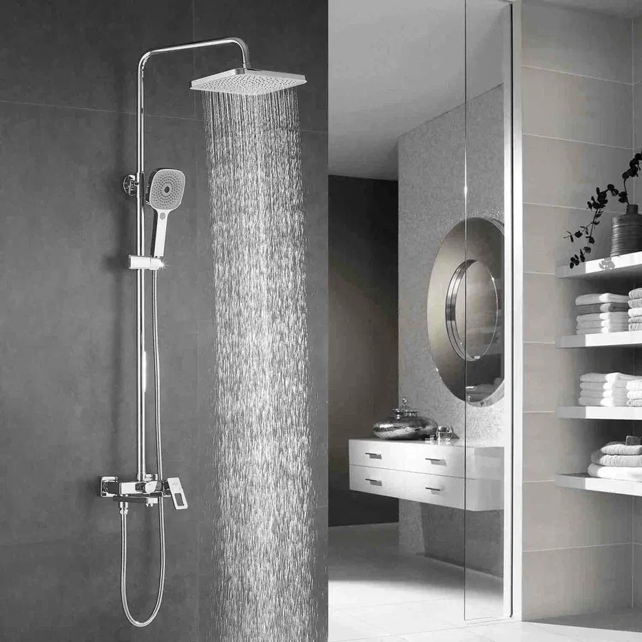Душевая система Shevanik S8236, хром. Количество режимов струи: 3. Размер верхнего душа: 29,5x19 см. Управление: рычажное. Излив для наполнения ванны: да.