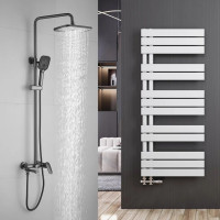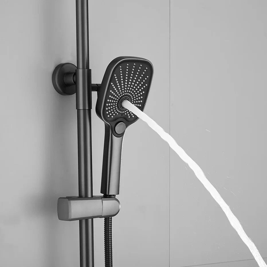 Душевая система Shevanik S8536T, оружейная сталь. Количество режимов струи: 3. Размер верхнего душа: 30x19 см. Управление: рычажное. Излив для наполнения ванны: да.