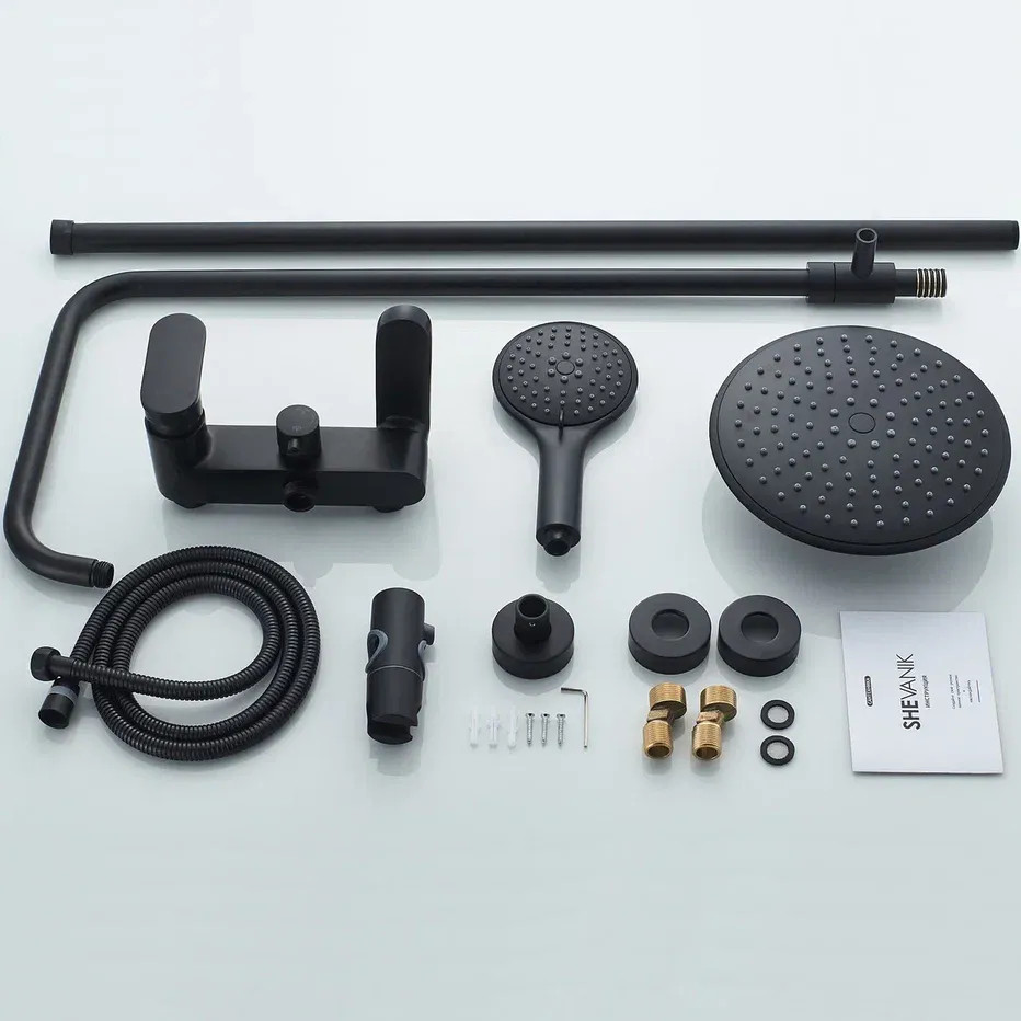 Душевая система Shevanik S8736H, черный. Количество режимов струи: 3. Размер верхнего душа: 23x23 см. Управление: рычажное. Излив для наполнения ванны: да.