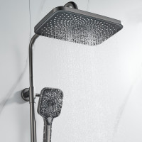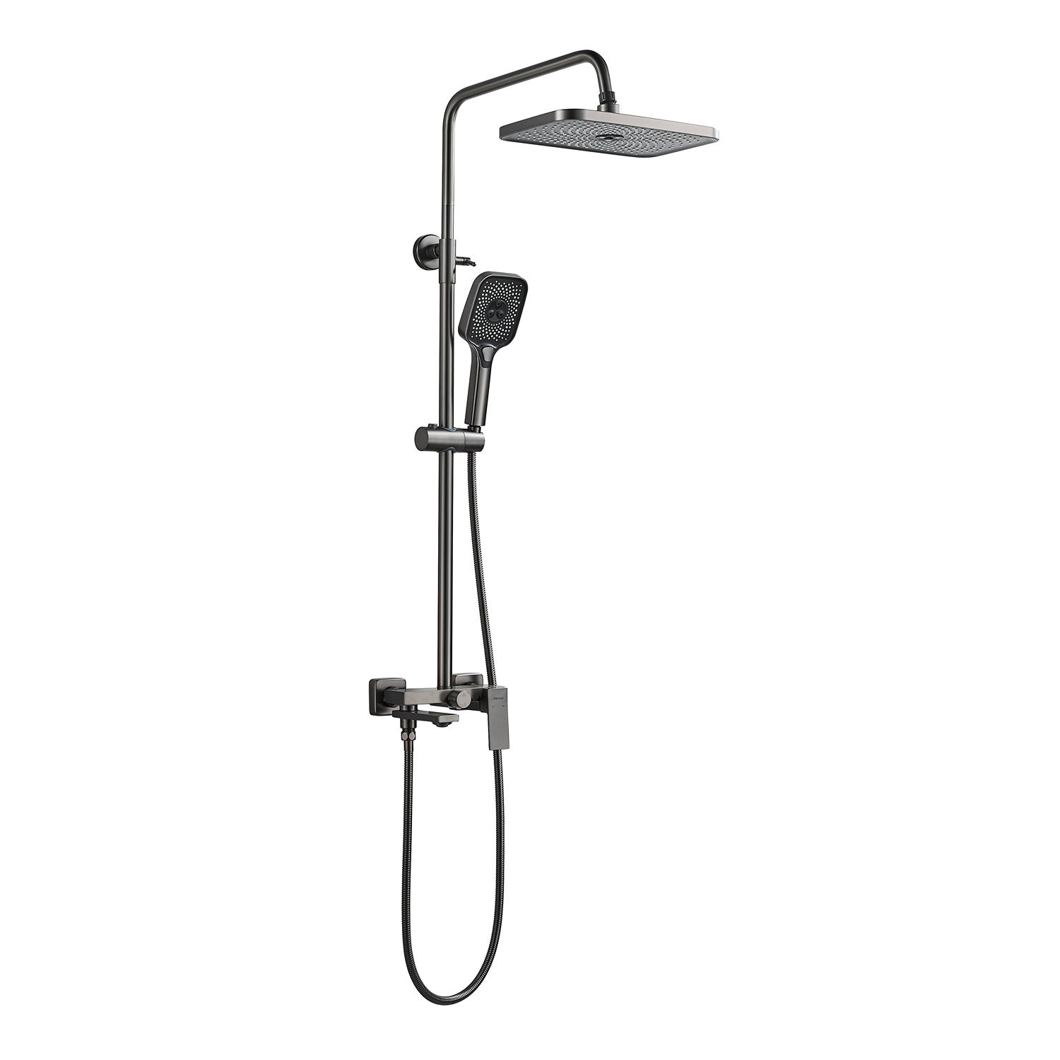Душевая система Shevanik S9636T, оружейная сталь. Количество режимов струи: 3. Размер верхнего душа: 29x19,5 см. Управление: рычажное. Излив для наполнения ванны: да.