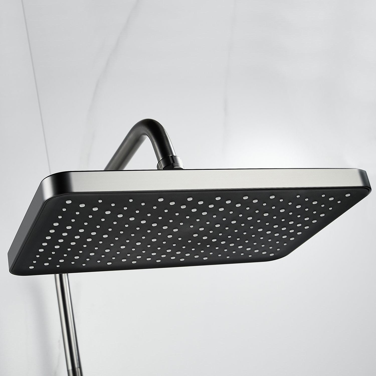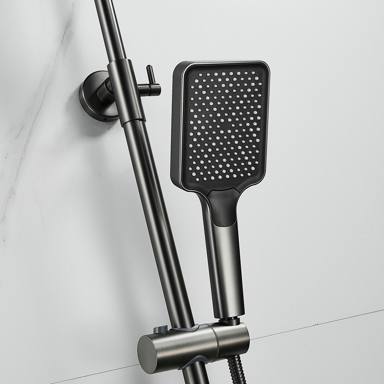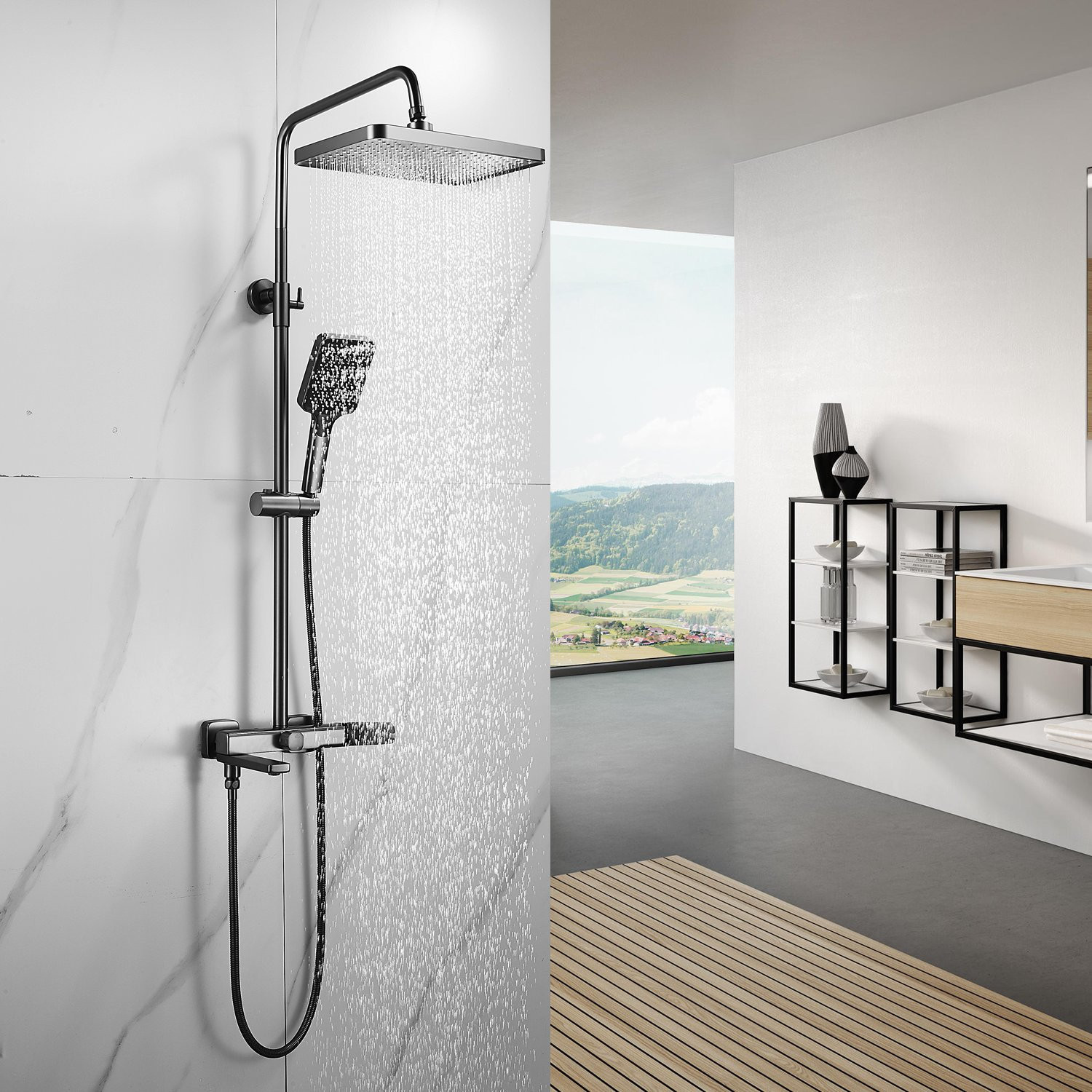 Душевая система Shevanik S9936T, оружейная сталь. Количество режимов струи: 3. Размер верхнего душа: 32x21 см. Управление: рычажное. Излив для наполнения ванны: да.
