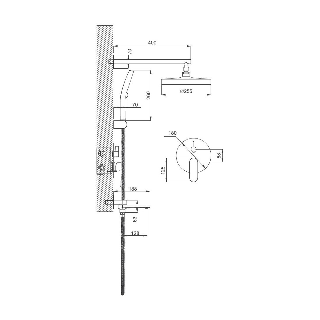 Система включает в себя шланговое подключение для смешанной воды с поворотным изливом и душевым шлангом. Излив оснащён аэратором, а его складывание служит переключателем потока воды на душевую лейку. Верхний душ диаметром 255 мм изготовлен из ABS-пластика и оснащён силиконовыми форсунками, которые легко очищаются от известкового налёта. Благодаря шарниру верхний душ можно регулировать по наклону вдоль всей оси.